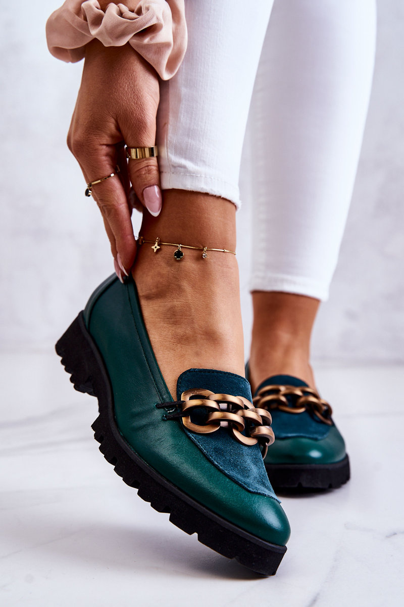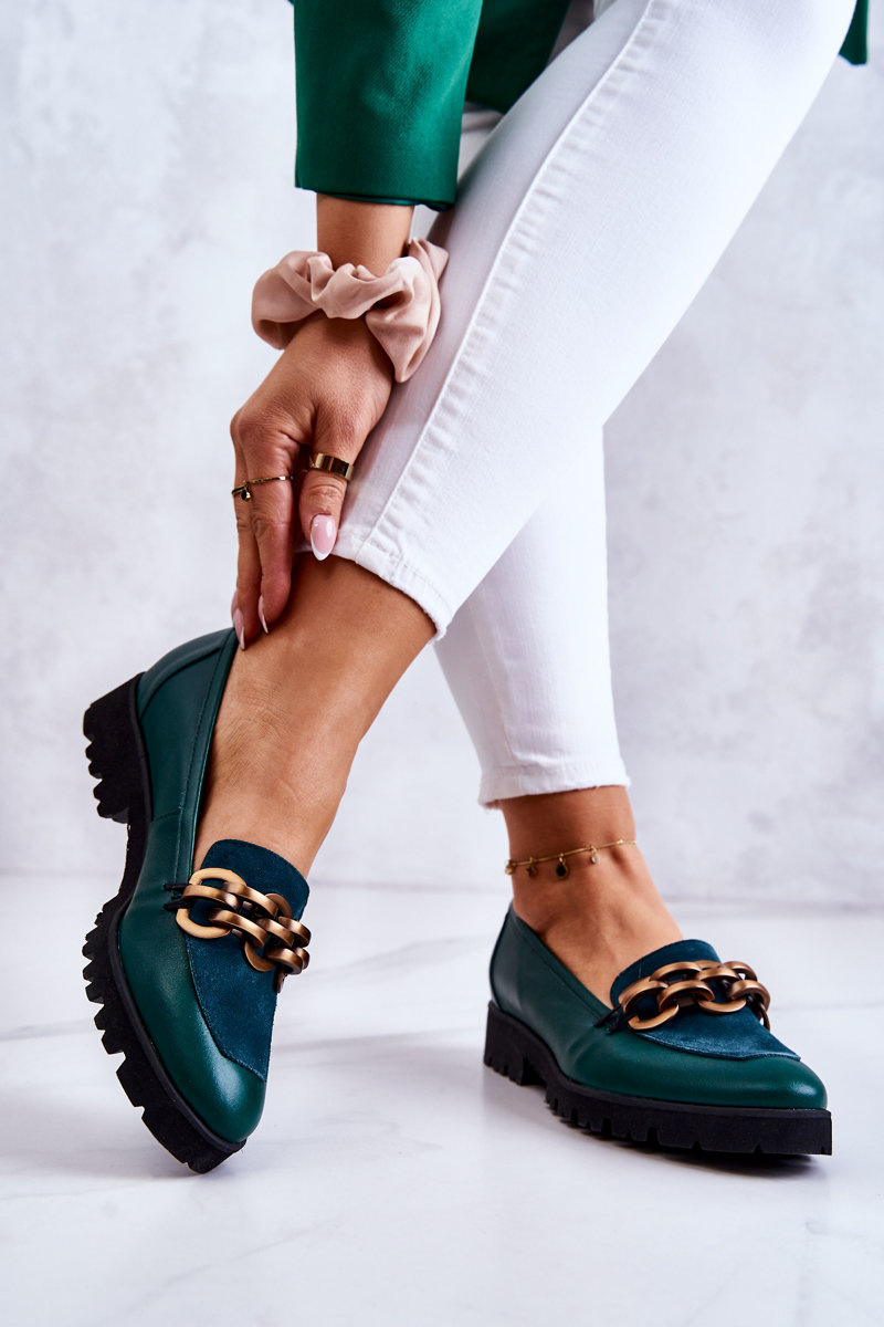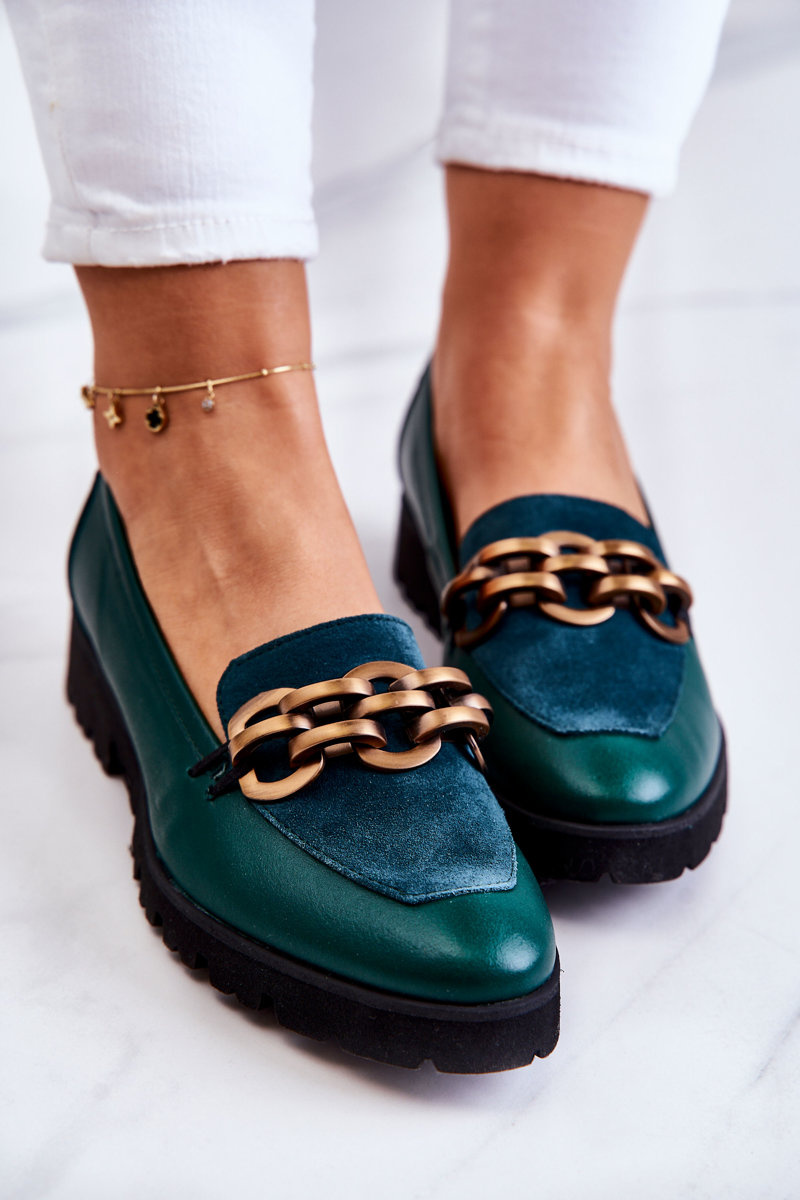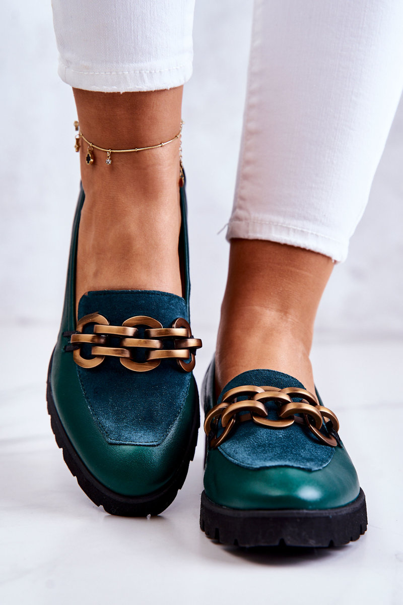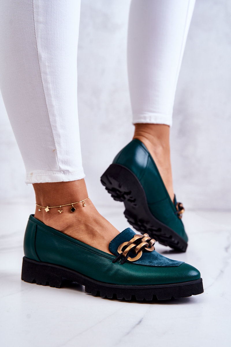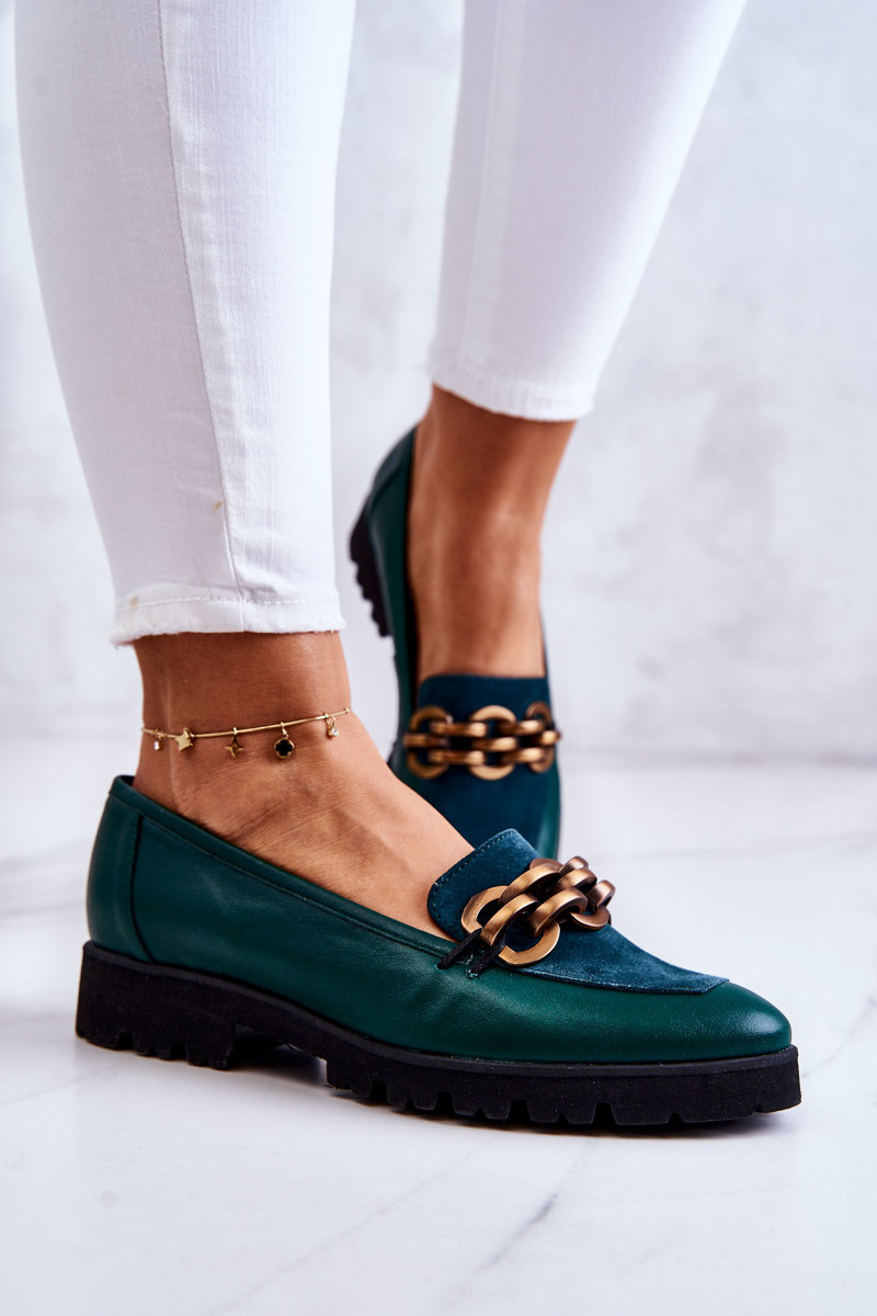 Eleganckie Skórzane Mokasyny Z Łańcuchem Zielone Geneva