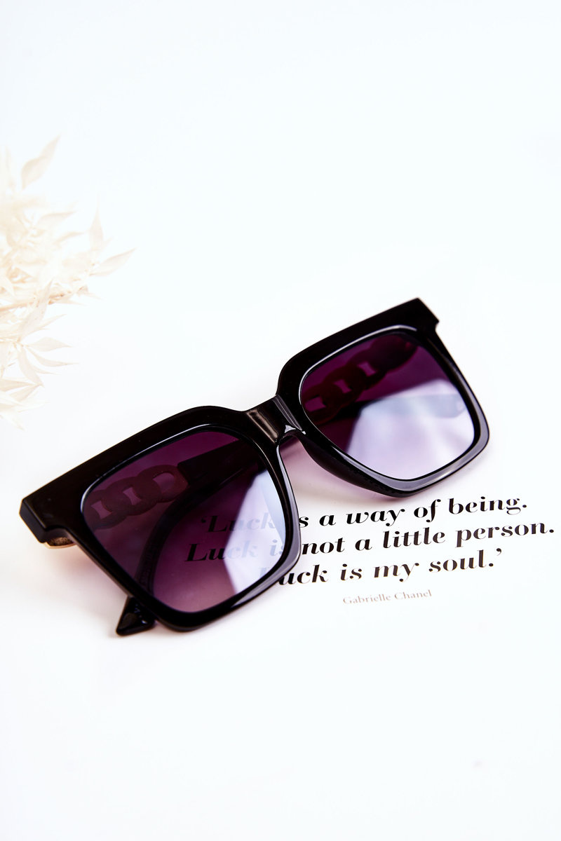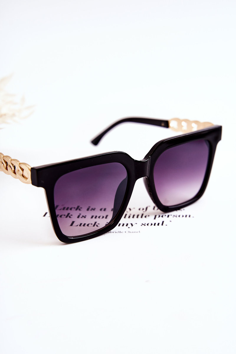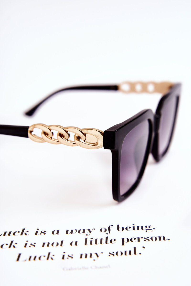 Modne okulary przeciwsłoneczne świetnie sprawdzą się w wielu sytuacjach! Nie tylko podczas letniego sezonu, ale także zimowego, kiedy promienie słoneczne odbijają się od śniegu. Model kwadratowy. Posiada cienkie oprawki soczewek u dołu i po bokach, grubsze u góry. Mostek z tworzywa sztucznego. Zauszniki wykonane z tworzywa sztucznego z ozdobnym dodatkiem w postaci łańcucha. Informacja od producenta: okulary absorbują szkodliwe promienie UV, kategoria 3.