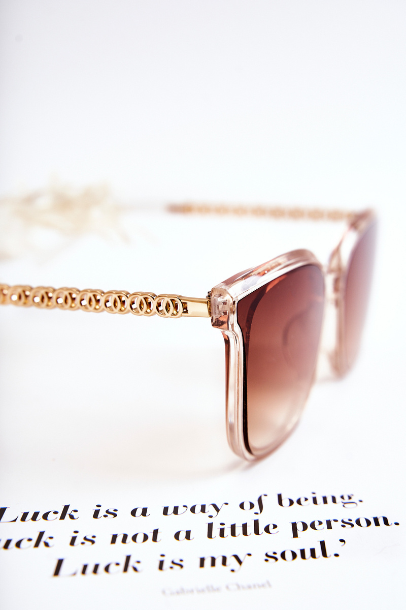 Wyjątkowe i stylowe okulary przeciwsłoneczne świetnie sprawdzą się w wielu sytuacjach! Nie tylko podczas letniego sezonu, ale także zimowego, kiedy promienie słoneczne odbijają się od śniegu. Model ten został wykonany z tworzywa sztucznego. Złota ozdoba w postaci przeplatających się kółek zdobi zauszniki. Informacja od producenta: okulary absorbują szkodliwe promienie UV, kategoria 2.
