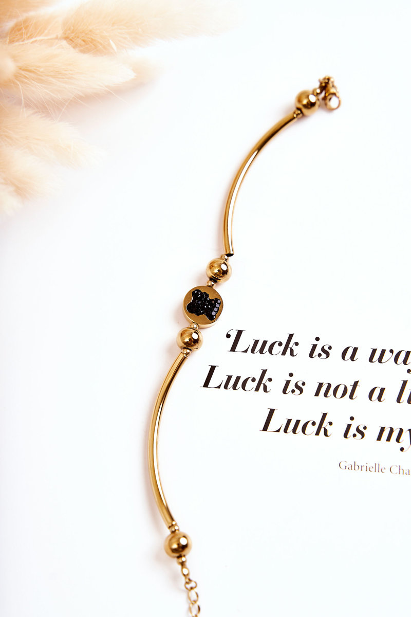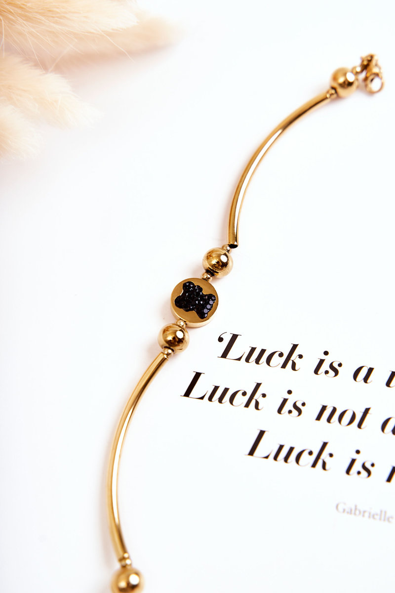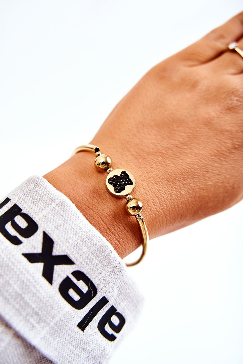 Wyjątkowa bransoletka damska wykonana ze stali nierdzewnej. Posiada możliwość regulacji długości. Ozdoby w postaci misia z imitacji cyrkonii w kole oraz kulki. Bransoletka posiada wykonane ze stali nierdzewnej usztywniane elementy. Prezentuje się niezwykle wyjątkowo. Koniecznie sprawdź także pozostałą naszą ofertę dostępnych modeli biżuterii. Świetny model, musisz go mieć!