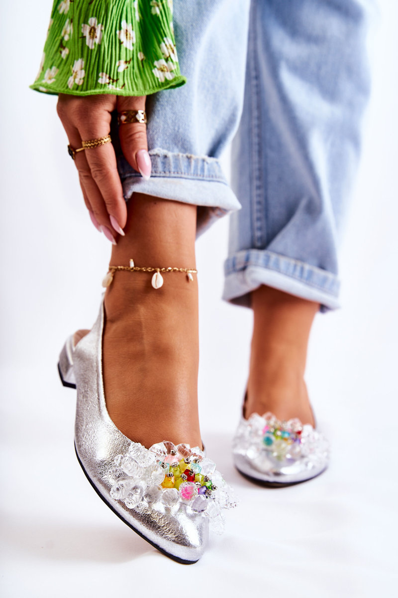 Skórzane Baleriny Na Obcasie Z Ozdobą Srebrne Elenie