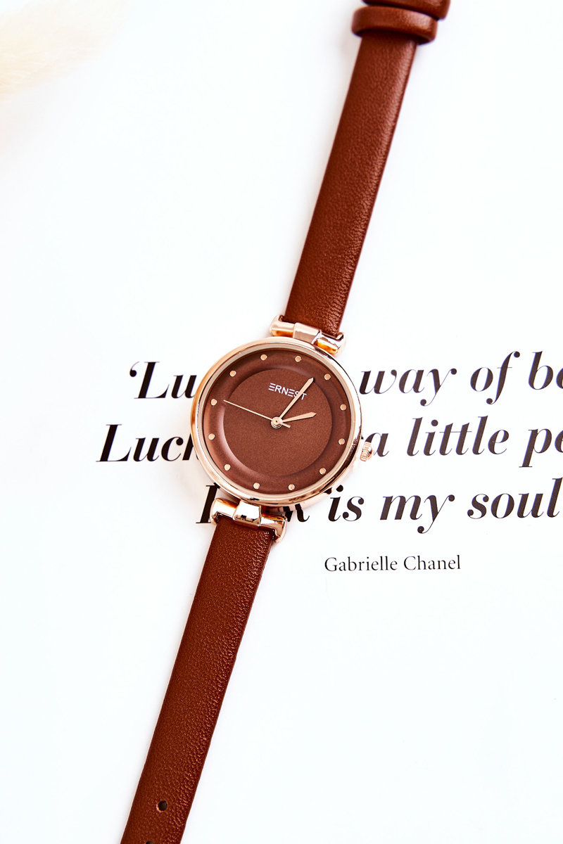Damski zegarek Ernest to model dla każdej kobiety uwielbiającej modne dodatki! Zegarek idealny na co dzień. Posiada regulowany pasek ze skóry ekologicznej. Zapinany na sprzączkę. Tarcza w odcieniu paska zegarka. Wykonany z nierdzewnej stali. Nie zawiera niklu. Koniecznie powinnaś go mieć!