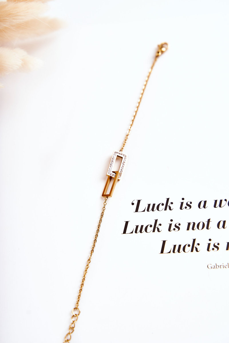 Damska bransoletka na cienkim łańcuszku typu celebrytka. Została wykonana ze stali nierdzewnej. Posiada możliwość regulacji długości. Na środku bransoletki znajduje się ozdoba w postaci dwóch prostokątów, z czego jeden jest przyozdobiony cyrkoniami. Taki rodzaj biżuterii jest świetnym dodatkiem do stylizacji nie tylko tych codziennych, ale i tych bardziej eleganckich. Model ten posiada klasyczne zapięcie. Koniecznie sprawdź także pozostałe modele biżuterii dostępnej w naszej ofercie!