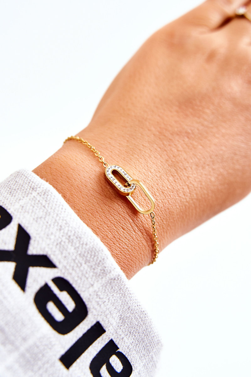 Damska bransoletka na cienkim łańcuszku typu celebrytka. Została wykonana ze stali nierdzewnej. Posiada możliwość regulacji długości. Na środku bransoletki znajduje się ozdoba w postaci dwóch owalnych elementów, z czego jeden jest przyozdobiony cyrkoniami. Taki rodzaj biżuterii jest świetnym dodatkiem do stylizacji nie tylko tych codziennych, ale i tych bardziej eleganckich. Model ten posiada klasyczne zapięcie. Koniecznie sprawdź także pozostałe modele biżuterii dostępnej w naszej ofercie!