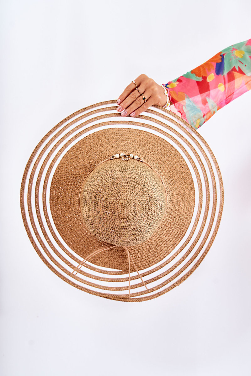 Damski kapelusz z ozdobnym, rzemykowym paskiem. Dodatkowo posiada kolorową zawieszkę z motylkiem i imitacją pereł przymocowaną do paseczka. Kapelusz wykonany jest w 86 % z papieru, 12 % poliestru. Produkt posiada sznureczek, co umożliwia regulację. Na rondzie kapelusza znajdują się wstawki z transparentnej siateczki. Koniecznie sprawdź całą naszą kolekcję kapeluszy!