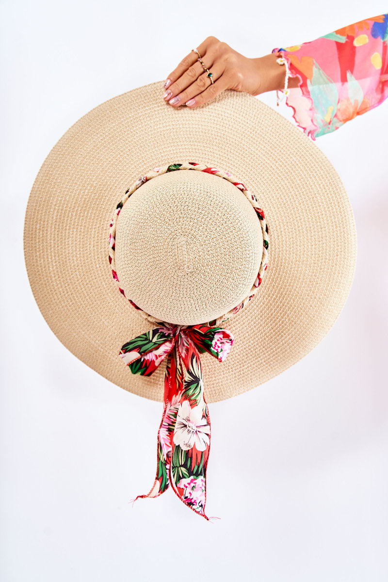 Damski kapelusz z pięknym paskiem, który posiada kolorową kokardę z motywem kwiatów. Produkt wykonany w 100 % z papieru. Posiada sznureczek umożliwiający regulację i dopasowanie do obwodu głowy. Rondo kapelusza jest dość szerokie. Kapelusz możesz wykorzystać podczas urlopu w upalne dni. Koniecznie sprawdź całą naszą kolekcję kapeluszy!