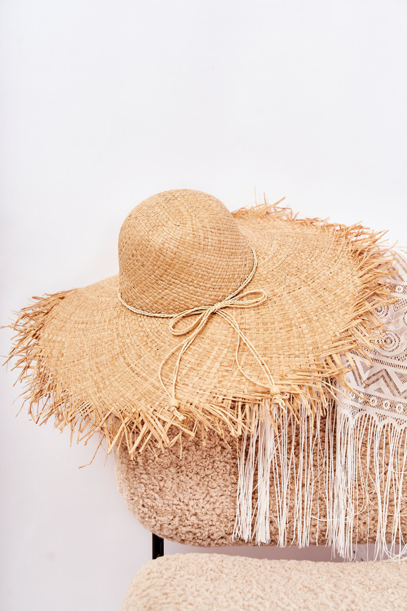 Lekki damski kapelusz słomkowy idealny na słoneczne dni. Produkt wykonany w 100 % ze słomy. Kapelusz posiada słomiany pasek z kokardą na, której końcu znajdują się ozdobne koraliki. Obrzeża ronda są postrzępione. Kapelusz możesz wykorzystać podczas urlopu w upalne dni. Koniecznie sprawdź całą naszą kolekcję kapeluszy!