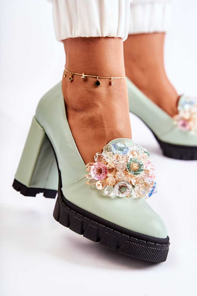 Eleganckie Czółenka Z Ozdobą Gładkie Zielone Caterine - Czarna Podeszwa