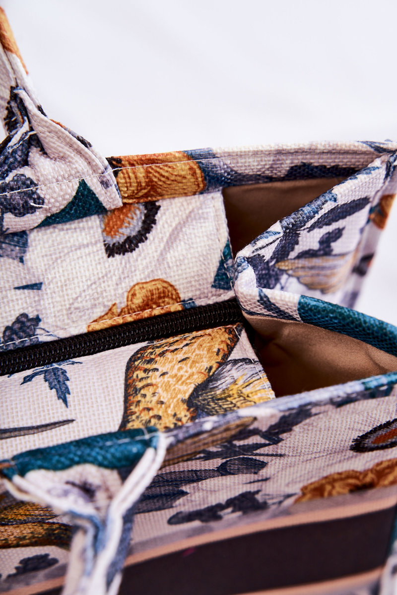 Usztywniana, duża torebka z cudnym wzorem. Torebka świetnie sprawdzi się jako dodatek do wiosenno-letnich stylizacji. Wykonana z materiału tekstylnego. Skład: 50% poliestru, 50% bawełny. Komora zamykana na suwak. Dodatkowo do torebki jest dołączony odpinany, regulowany pasek. W środku znajdują się dwie mniejsze, otwarte kieszonki oraz jedna większa z gumką. Torebka posiada także wzmacniany dół wewnątrz.