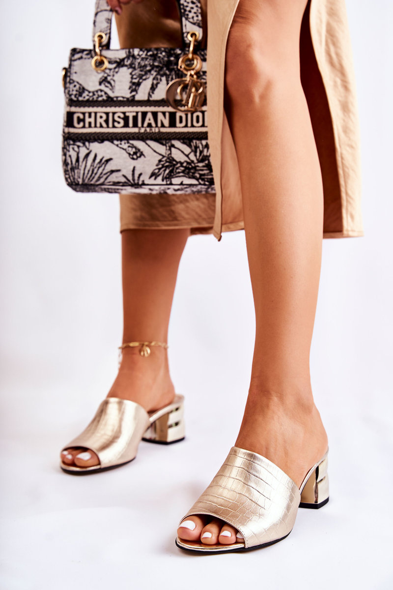 Skórzane Klapki Damskie Wzór Krokodyl Na Obcasie Złote Perry