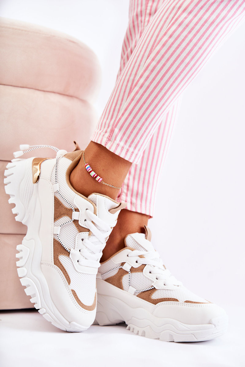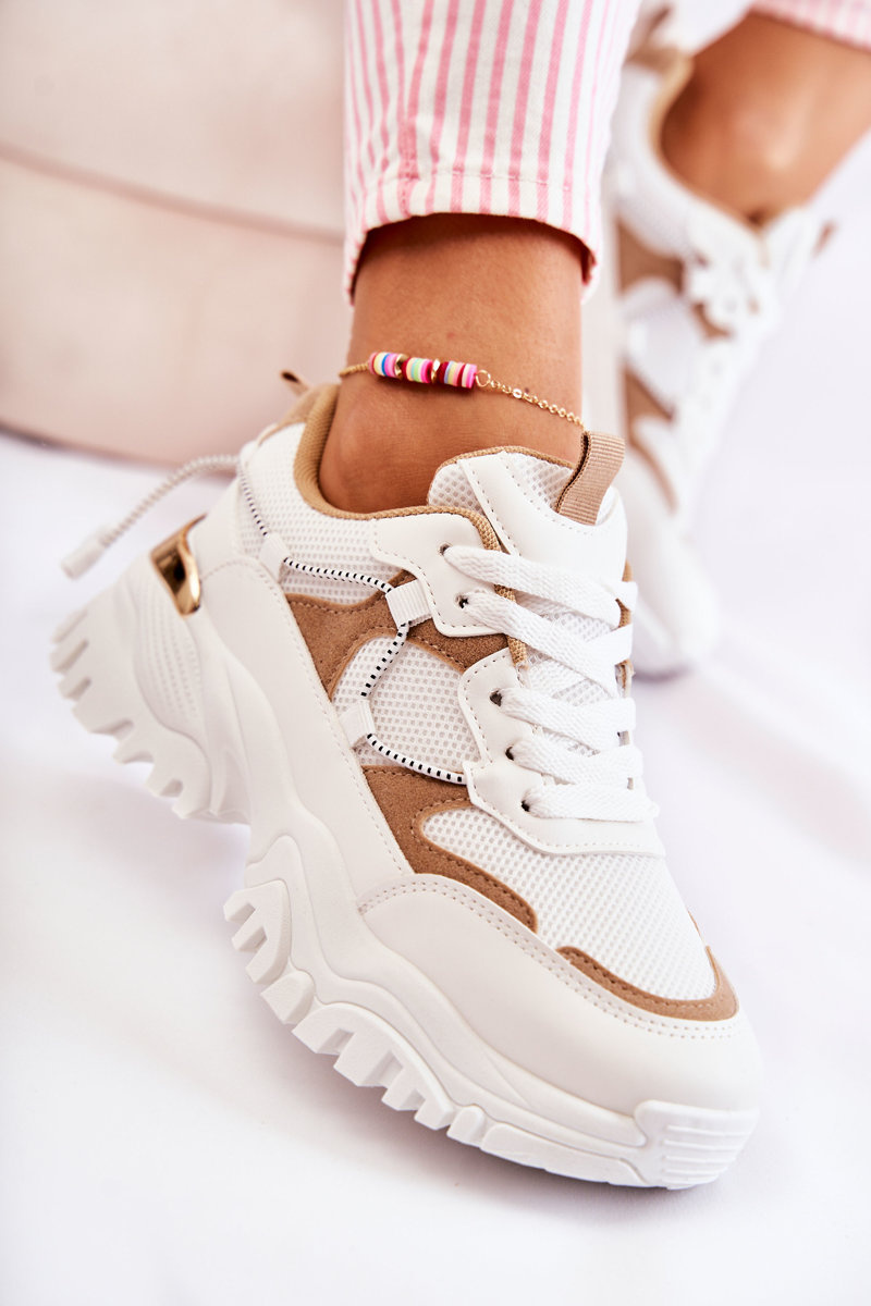 Modne Materiałowe Buty Sportowe Beżowo-Białe Amariso