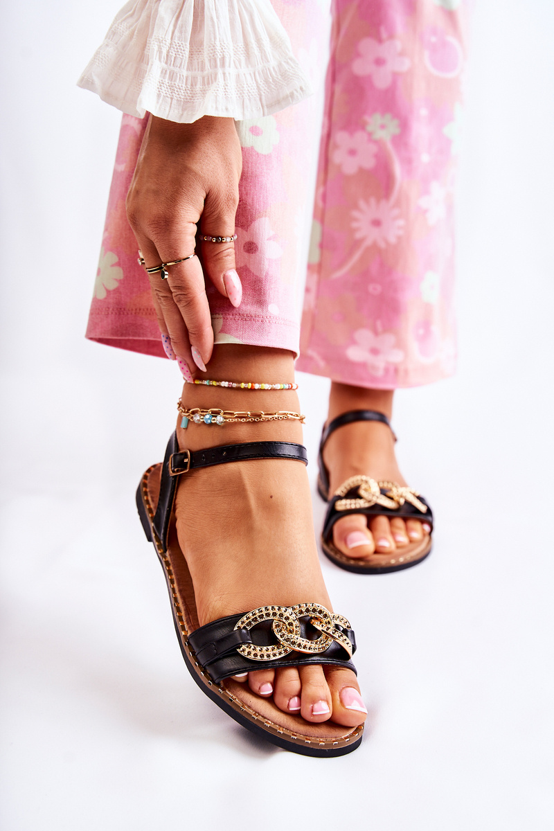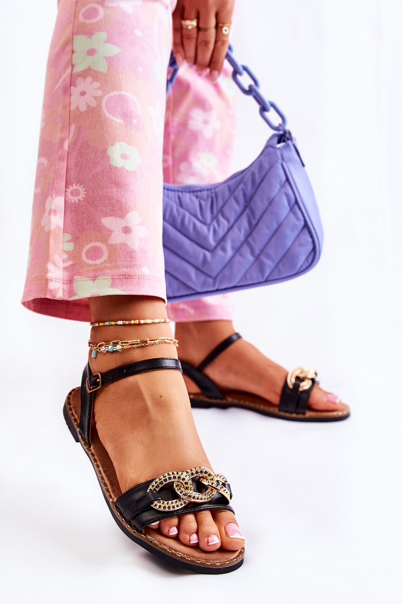 Damskie Sandałki Na Płaskim Obcasie Z Łańcuchem Czarne Minevra