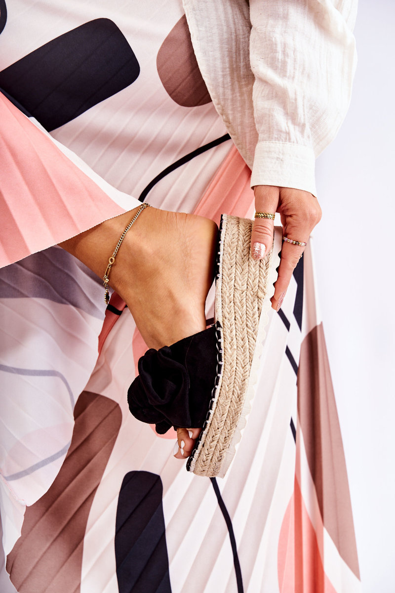 Wygodne klapki wykonane z wysokiej jakości eko zamszu. Wkładka wykonana z połączenia eko zamszu oraz tkaniny. Buty osadzone na platformie wraz z koturnem. Dodatkowo przyozdobione warkoczem z juty. Na przednim pasku znajduje się urocza kokarda. Podeszwa z tworzywa sztucznego. Model idealny na co dzień. Koniecznie powinnaś go mieć! Przy wyborze rozmiaru prosimy sugerować się tabelą rozmiarów.