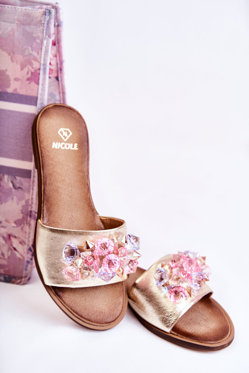 Skórzane Damskie Klapki Z Ozdobą Nicole 2726 Złote