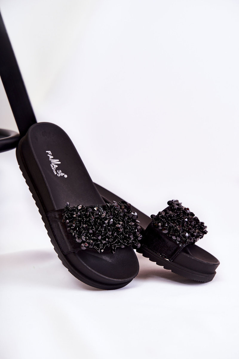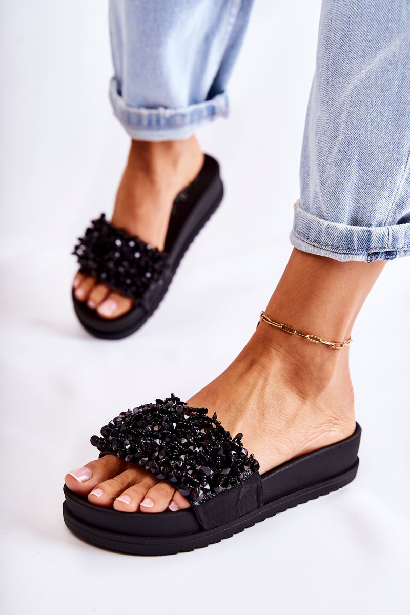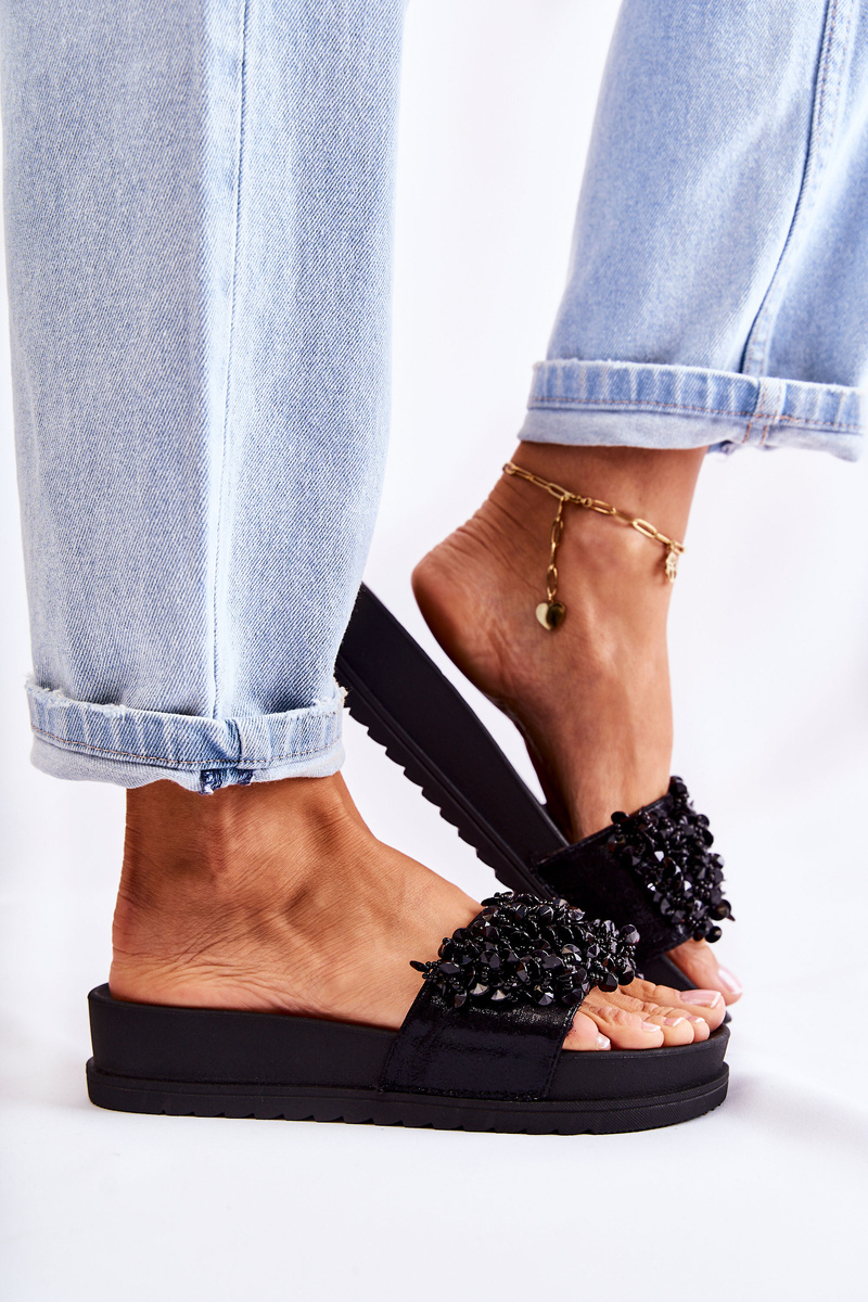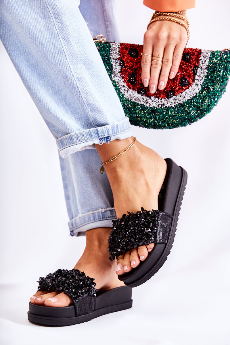 Damskie Klapki Na Platformie Z Ozdobami Czarne Almina