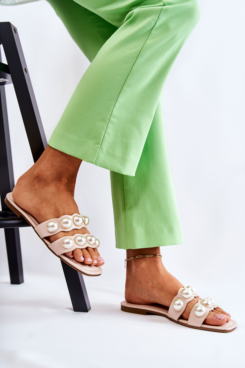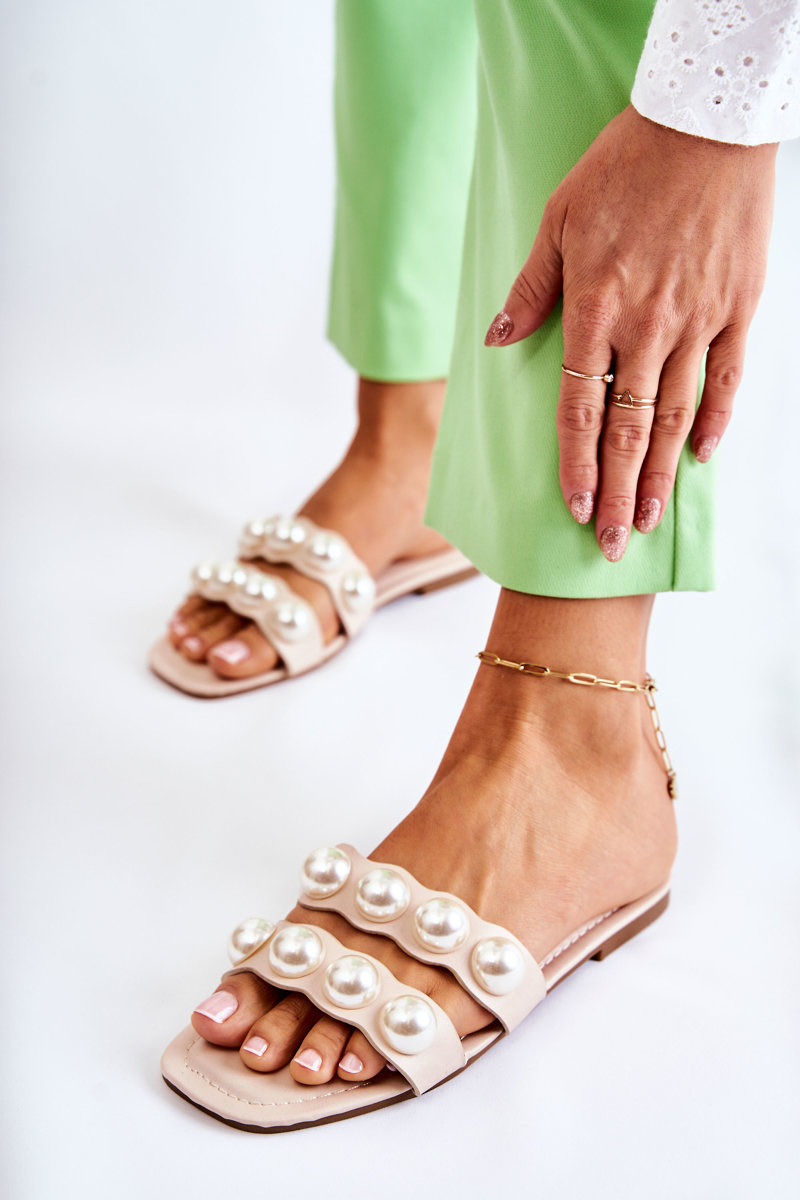 Damskie Skórzane Klapki Z Ozdobnymi Perełkami Beżowe Lasello