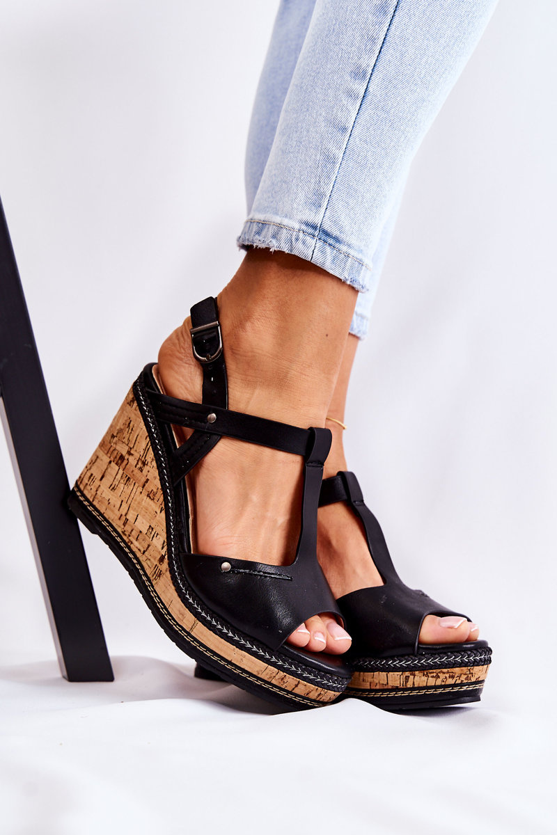 Klasyczne Skórzane Sandały Na Koturnie Czarne Valorin
