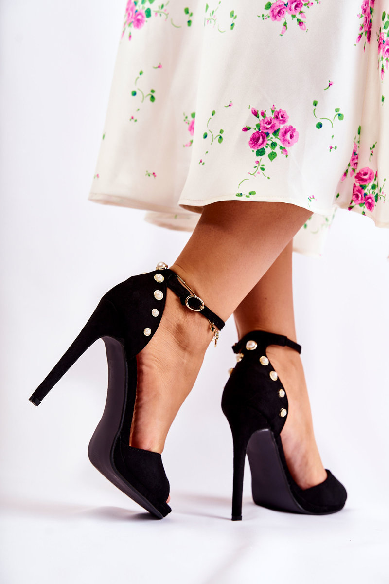 Niezwykłe sandały na klasycznym obcasie w postaci wysokiej szpilki. Wykonane z eko zamszu ze zdobieniami w postaci imitacji pereł. Nosek odkryty, zaokrąglony. Zapinane wokół kostki na regulowany pasek ze sprzączką. Wkładka z eko skóry jest miękka i wygodna w użytkowaniu. Buty posiadają usztywniany zapiętek. Model ten skradnie serce niejednej miłośniczce wysokich obcasów! Sandałki te są idealne na różnego rodzaju uroczystości, takie jak: wesela czy na randkę. Przy wyborze rozmiaru prosimy sugerować się tabelą rozmiarów.