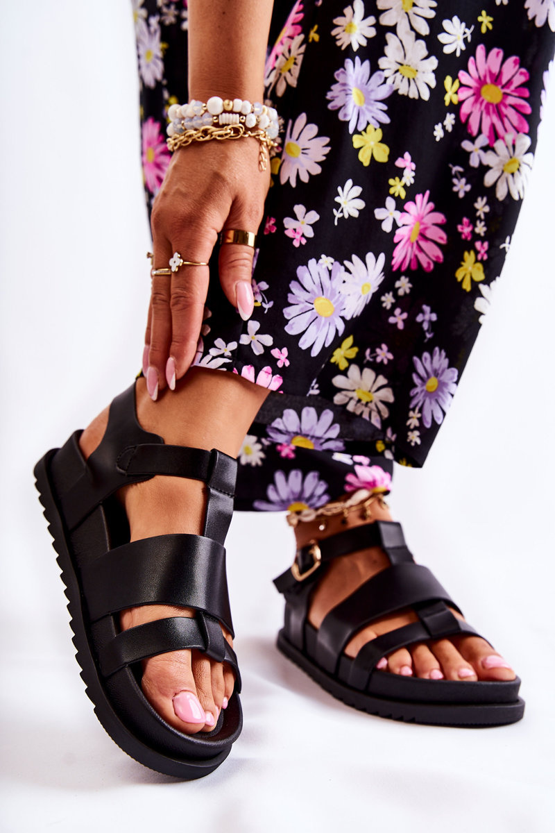 Modne oraz przewiewne sandały wykonane z eko skóry. Zapinane na regulowany pasek ze sprzączką. Sandałki posiadają odkryty, zaokrąglony nosek oraz odkrytą piętę. Miękka wkładka z tworzywa sztucznego zapewni wygodę podczas użytkowania. Dodatkowo wkładka jest profilowana. Platforma sprawia, że buty są niezwykle stabilne. Te sandałki to idealny fason na upalne dni. Świetnie będą prezentować się z zarówno ze spodniami, jak i sukienkami. Przy wyborze rozmiaru prosimy sugerować się tabelą rozmiarów.