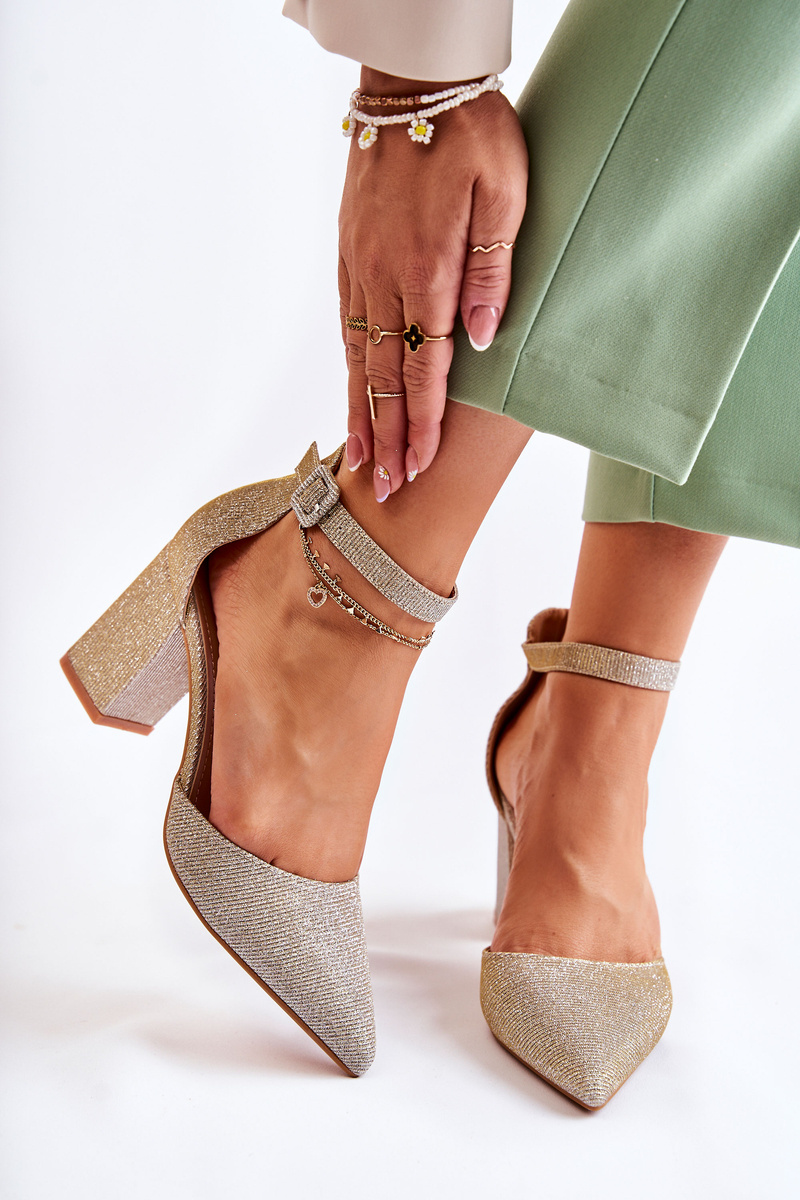 Niezwykłe czółenka na stabilnym obcasie w postaci słupka. Zapinane na regulowany pasek ze sprzączką znajdującą się na wysokości kostki. Model z noskiem w szpic. Buty te zostały wykonane z tkaniny, natomiast wkładka wykonana z eko skóry. Buty te posiadają usztywniany zapiętek. Idealne do wieczorowych sukienek czy eleganckich kombinezonów. Świetnie sprawdzą się podczas wielu uroczystości. Przy wyborze rozmiaru prosimy sugerować się tabelą rozmiarów.