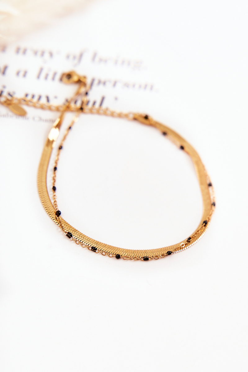 Piękna, podwójna bransoletka na nogę została wykonana ze stali nierdzewnej. Posiada jeden, cienki łańcuszek z małymi koralikami oraz łańcuszek typu żmijka. Bransoletka posiada możliwość regulacji długości. Świetnie będzie prezentować się na nodze. Posiada klasyczne zapięcie. Bransoletka nie posiada niklu. Koniecznie powinnaś ją mieć w swojej kolekcji bransoletek!