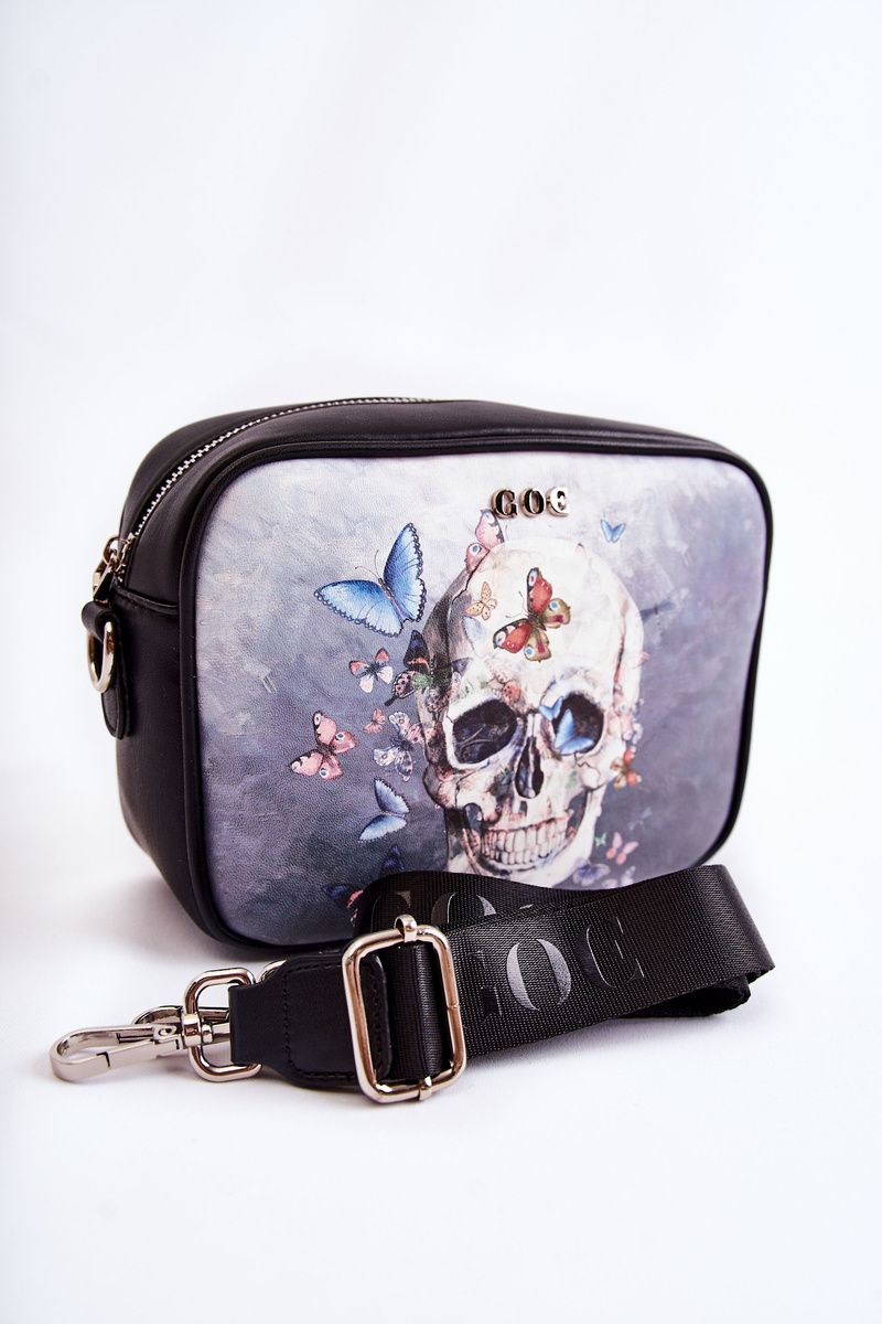 Wyjątkowa torebka od renomowanej marki GOE! Wykonana z wysokiej jakości eko skóry. Na przodzie znajduje się logo marki GOE oraz ozdobny motyw z czaszką i motylami. Torebka posiada jedną komorę, która jest zamykana na zamek błyskawiczny. W środku znajduje się jedna otwarta kieszonka oraz jedna zamykana na suwak. Podszewka wykonana z tkaniny w ozdobny wzór. Dodatkowo z tyłu torebki znajduje się kieszonka zamykana na suwak. Torebka posiada jeden regulowany, odpinany pasek.