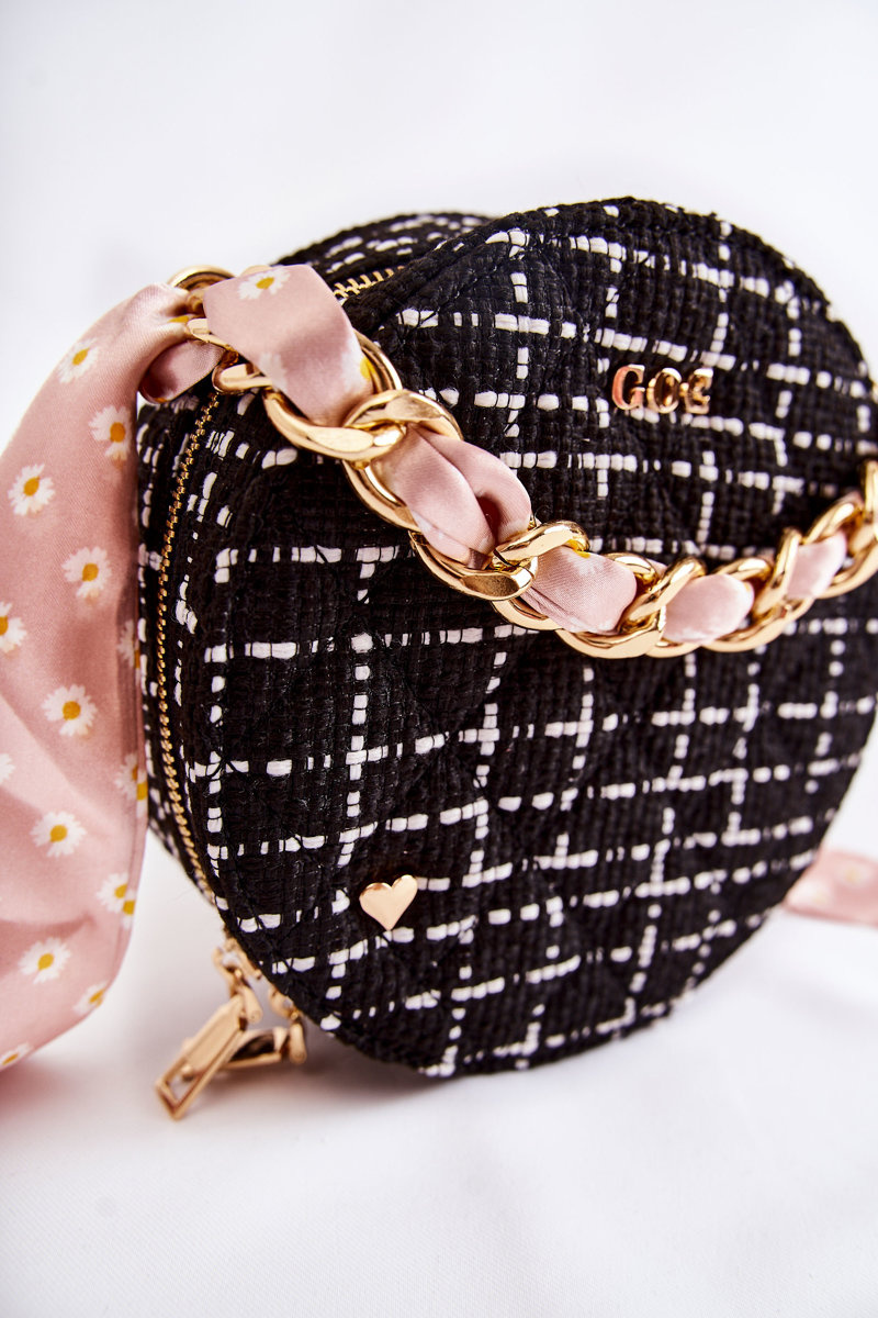 Modna torebka w fasonie kuferka od marki GOE! Wykonana z wysokiej jakości materiału, dodatkowo pikowana. Na przodzie znajduje się logo marki GOE oraz ozdobny emblemat w postaci serduszka. Torebka posiada jedną komorę, która jest zamykana na zamek błyskawiczny. W środku znajduje się jedna otwarta kieszonka oraz jedna zamykana na suwak. Podszewka wykonana z tkaniny w ozdobny wzór. Torebka posiada jeden regulowany, odpinany pasek. Dodatkowo torebka posiada łańcuszek opleciony wstążką, którą można zdjąć.