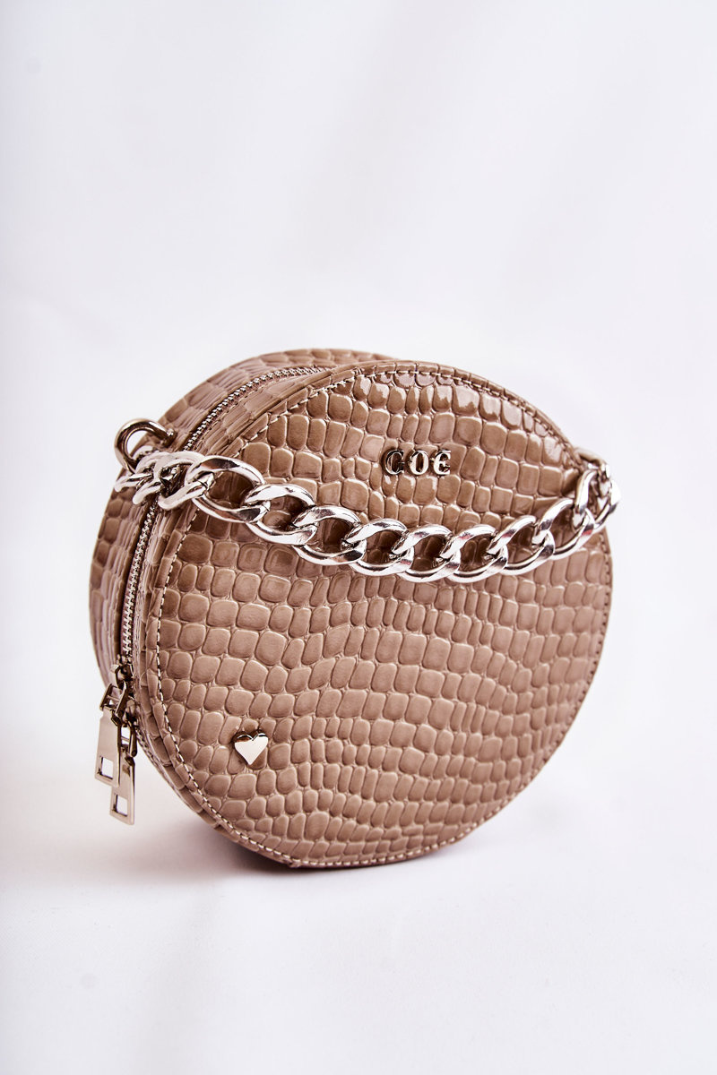 Modna torebka w fasonie kuferka od marki GOE! Wykonana z wysokiej jakości eko skóry. Na przodzie znajduje się logo marki GOE oraz ozdobny emblemat w postaci serduszka. Torebka posiada jedną komorę, która jest zamykana na zamek błyskawiczny. W środku znajduje się jedna otwarta kieszonka oraz jedna zamykana na suwak. Podszewka wykonana z tkaniny w ozdobny wzór. Torebka posiada jeden regulowany, odpinany pasek.