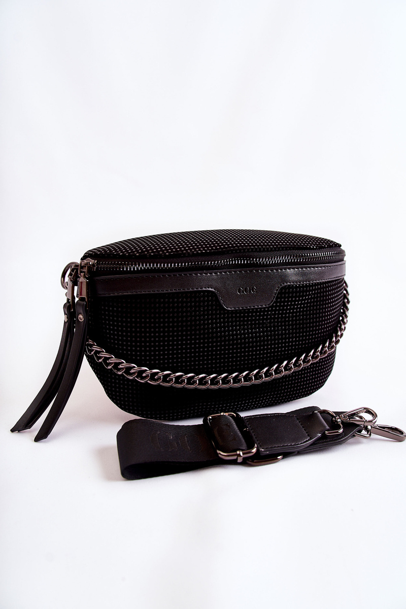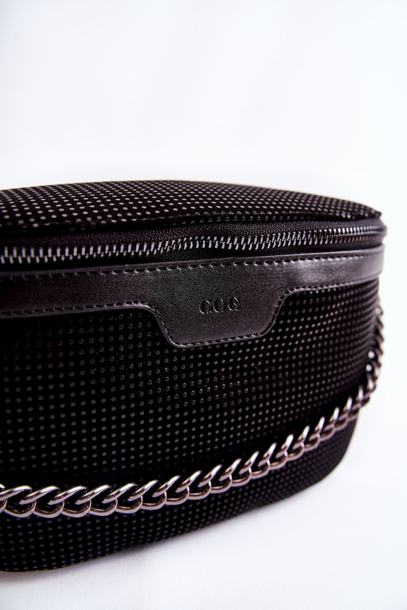 Damska torebka marki GOE została wykonana z wysokiej jakości materiału. Na przodzie znajduje się logo marki GOE. Torebka posiada jedną komorę, która jest zamykana na zamek błyskawiczny. W środku znajduje się jedna kieszonka zamykana na suwak. Torebka posiada ozdobny, nieodpinany łańcuch. Podszewka wykonana z tkaniny w ozdobny wzór. Dodatkowo do torebki jest dołączony regulowany, odpinany pasek.