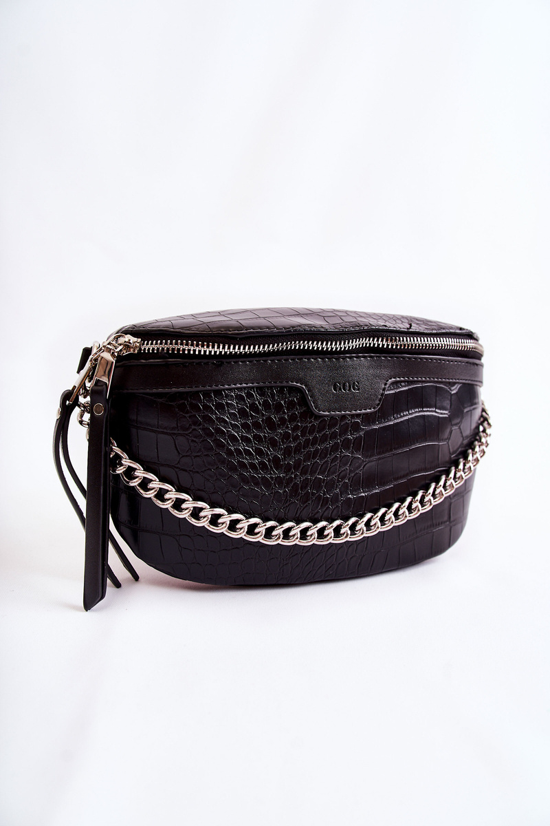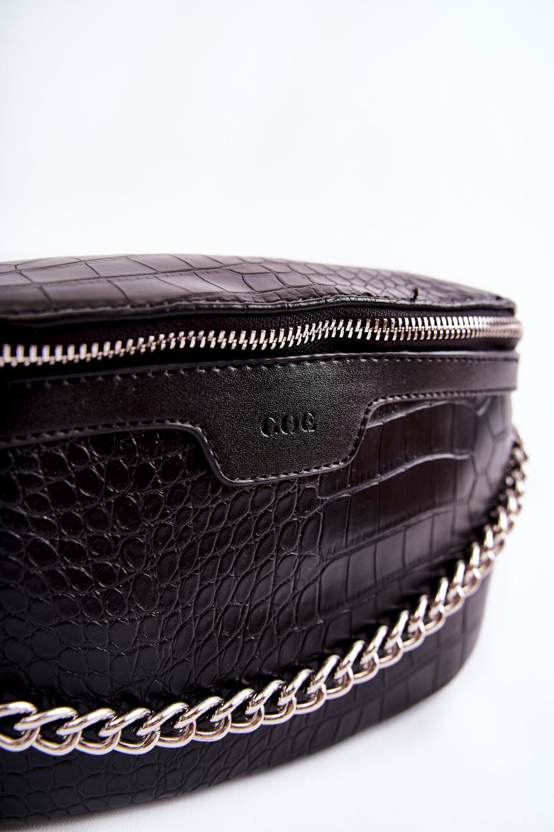 Damska torebka marki GOE została wykonana z wysokiej jakości eko skóry. Na przodzie znajduje się logo marki GOE. Torebka posiada jedną komorę, która jest zamykana na zamek błyskawiczny. W środku znajduje się jedna kieszonka zamykana na suwak. Torebka posiada ozdobny, nieodpinany łańcuch. Podszewka wykonana z tkaniny w ozdobny wzór. Dodatkowo do torebki jest dołączony regulowany, odpinany pasek.