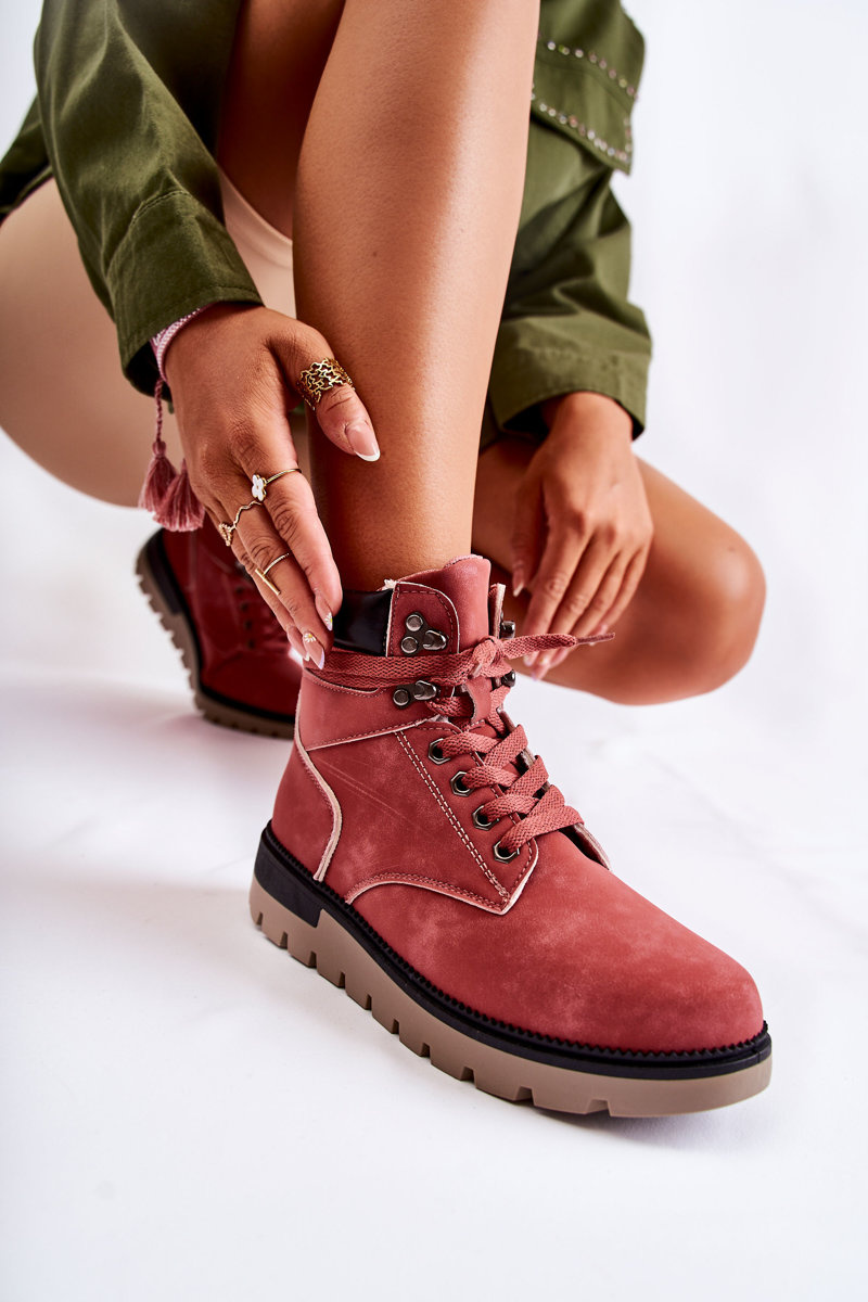 Botki damskie zostały wykonane z eko skóry. Model osadzony jest na platformie z charakterystycznymi żłobieniami. Posiadają zaokrąglony nosek. Cholewka zakrywająca kostkę z małą pętelką z tyłu ułatwiającą zakładanie obuwia. Wkładka oraz wyściółka ocieplone kocem obuwniczym. Klasyczne wiązanie na płaskie sznurowadła pozwoli na odpowiednie dopasowanie obuwia do tęgości nogi. Przy wyborze rozmiaru prosimy sugerować się tabelą rozmiarów.