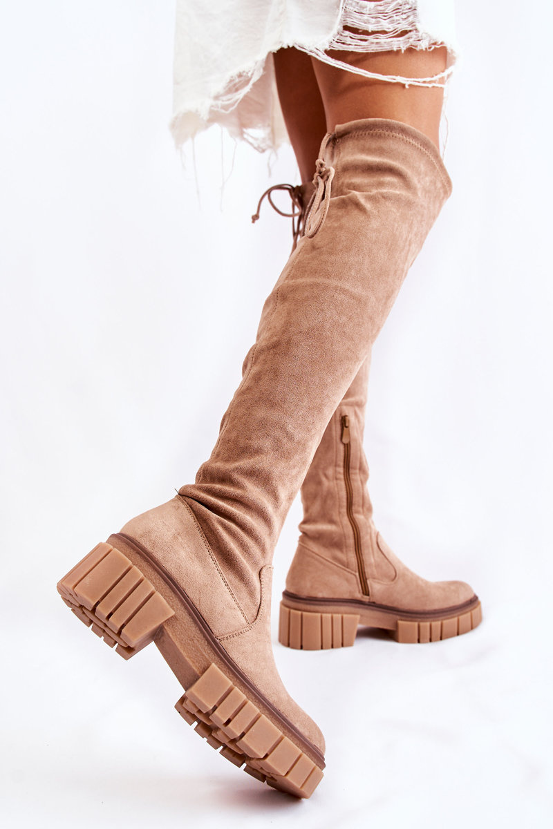 Zamszowe Damskie Kozaki Za Kolano Beżowe Cheera