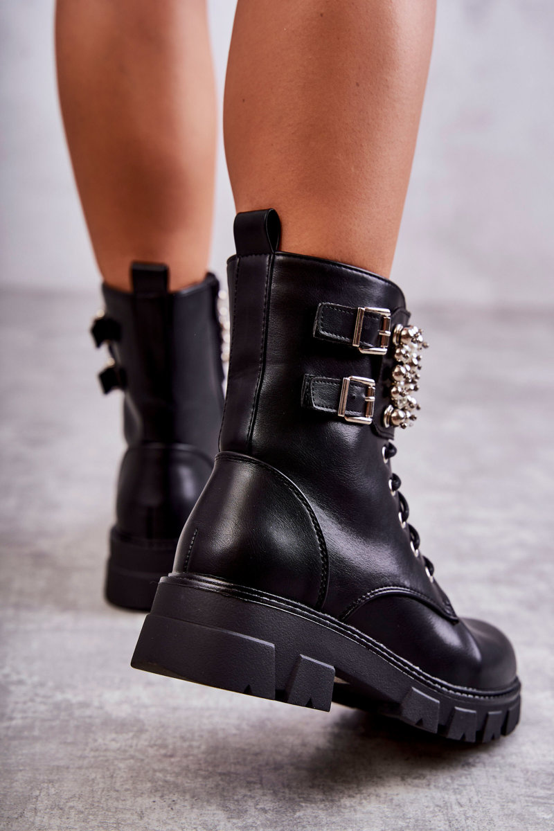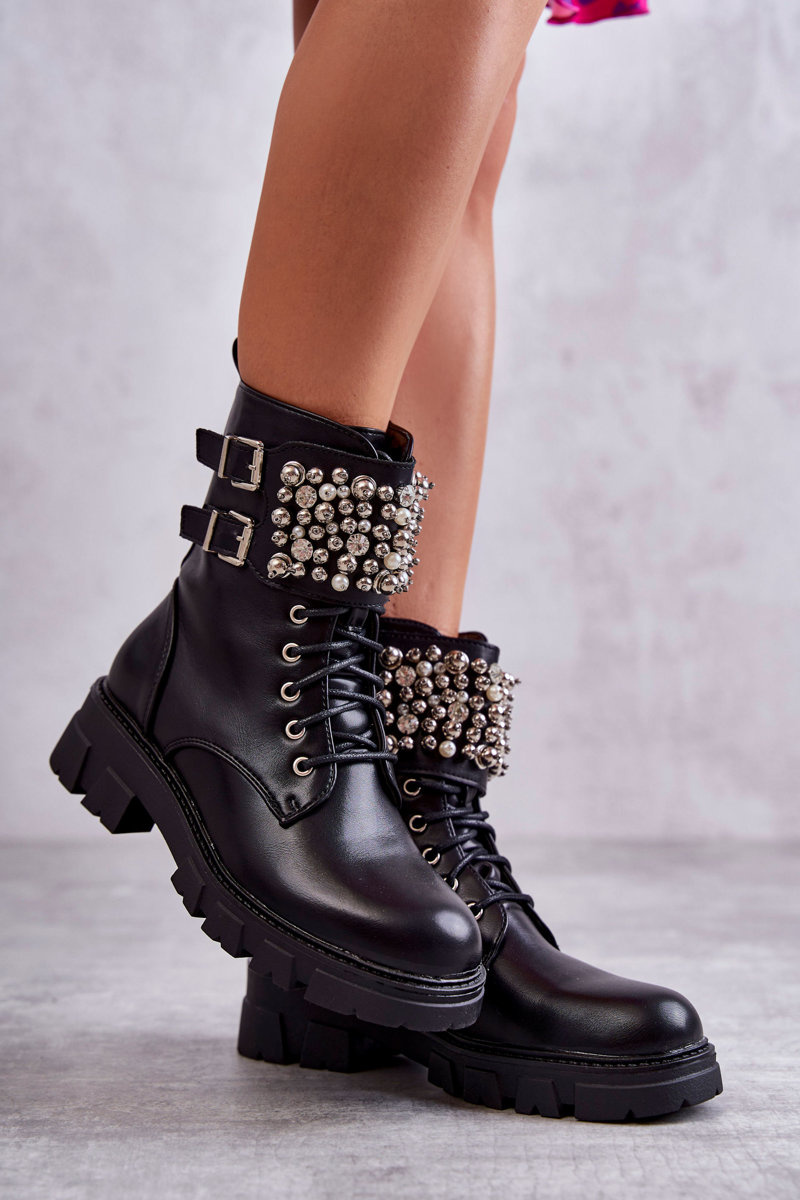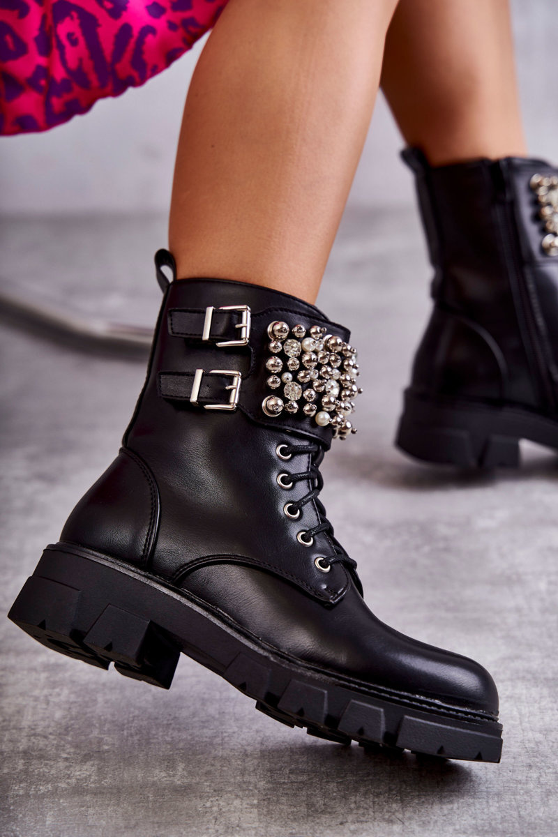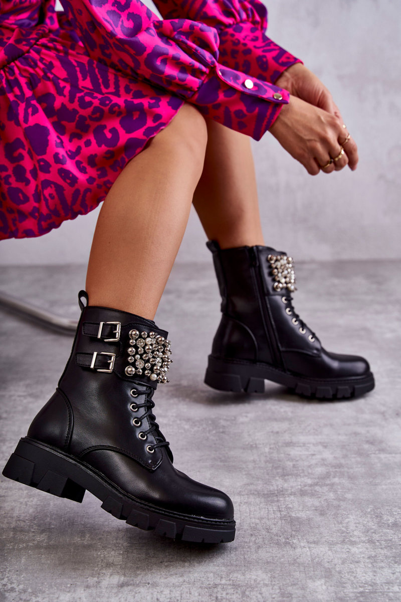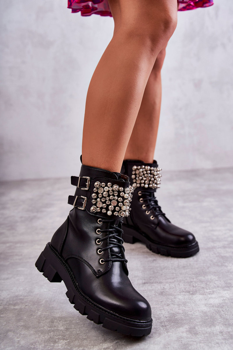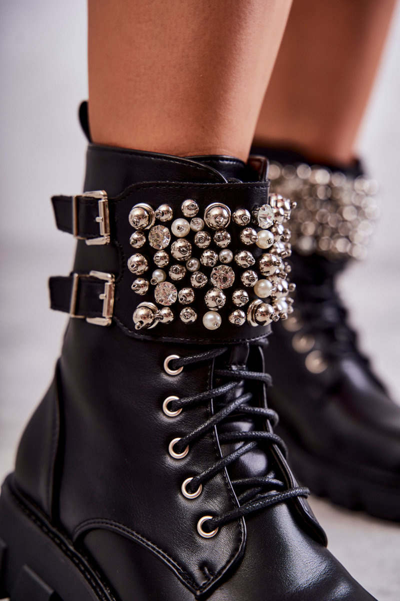 Damskie Botki Z Ozdobami Wiązane Czarne Leonese