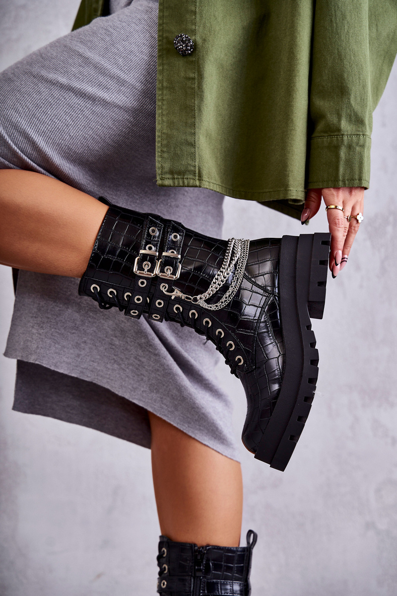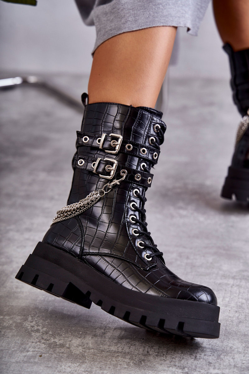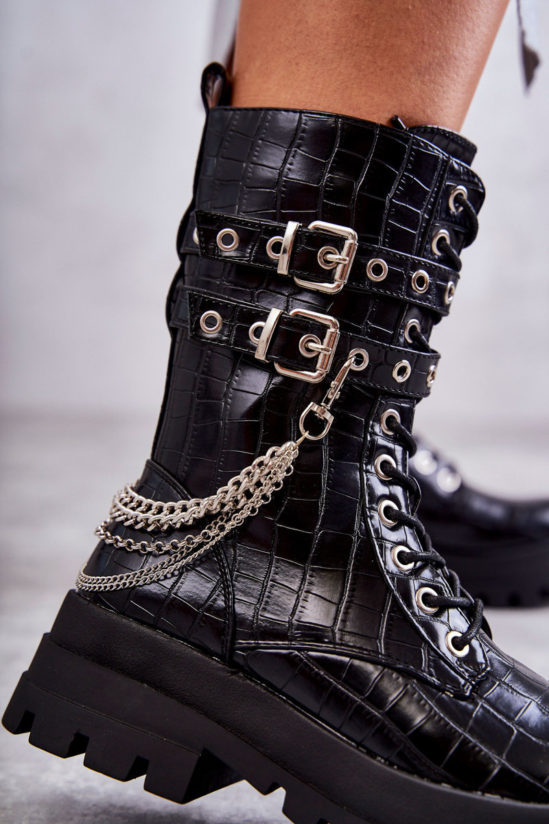 Wysokie Workery Botki Z Łańcuchem Wężowe Czarne Montero
