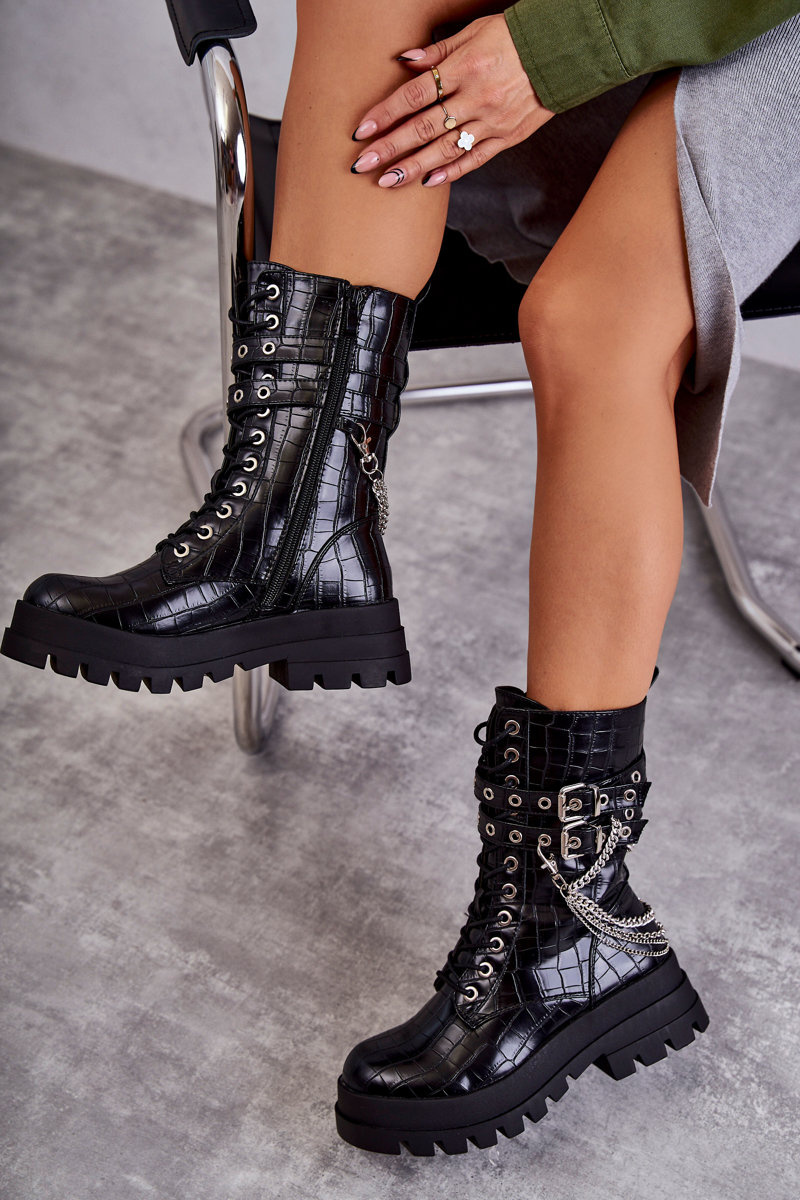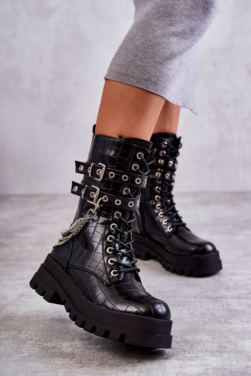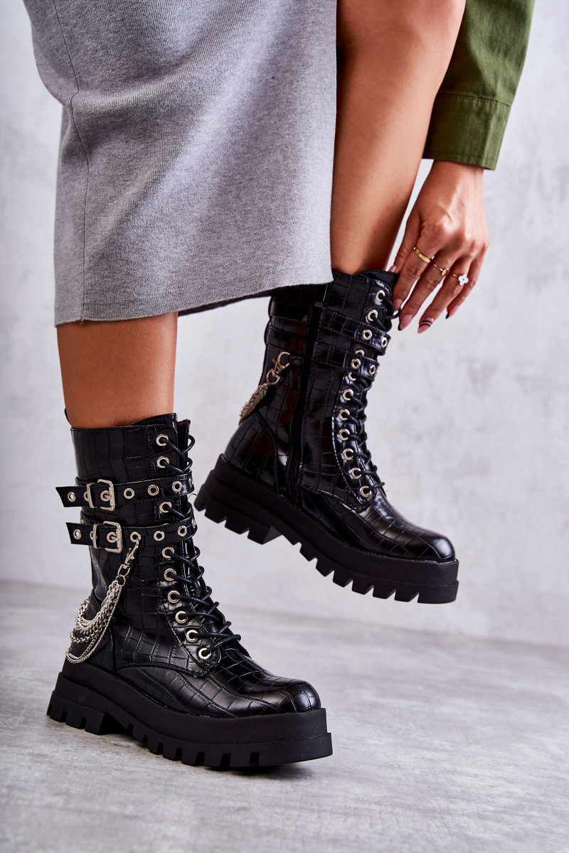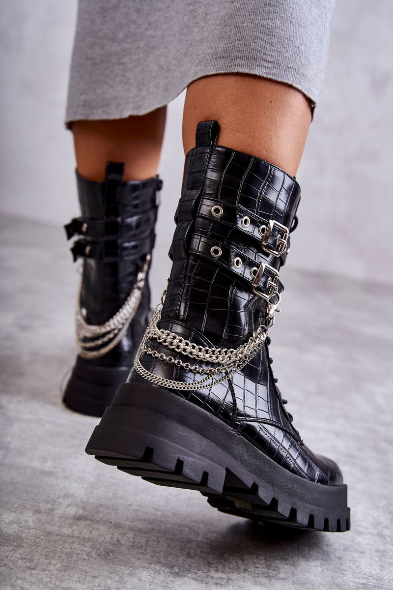 Wysokie Workery Botki Z Łańcuchem Wężowe Czarne Montero