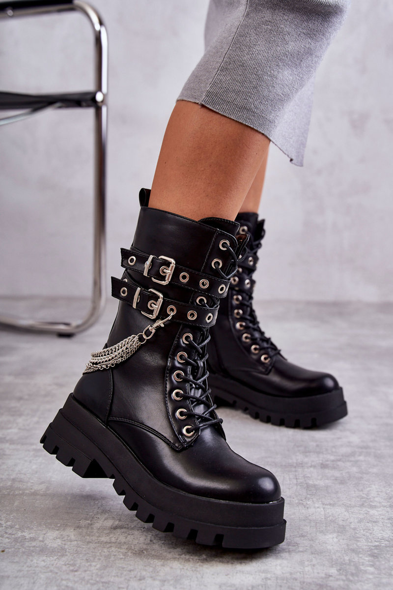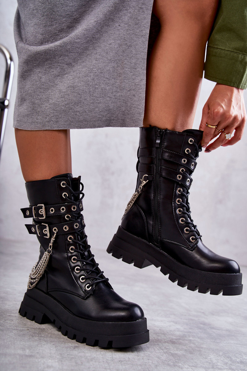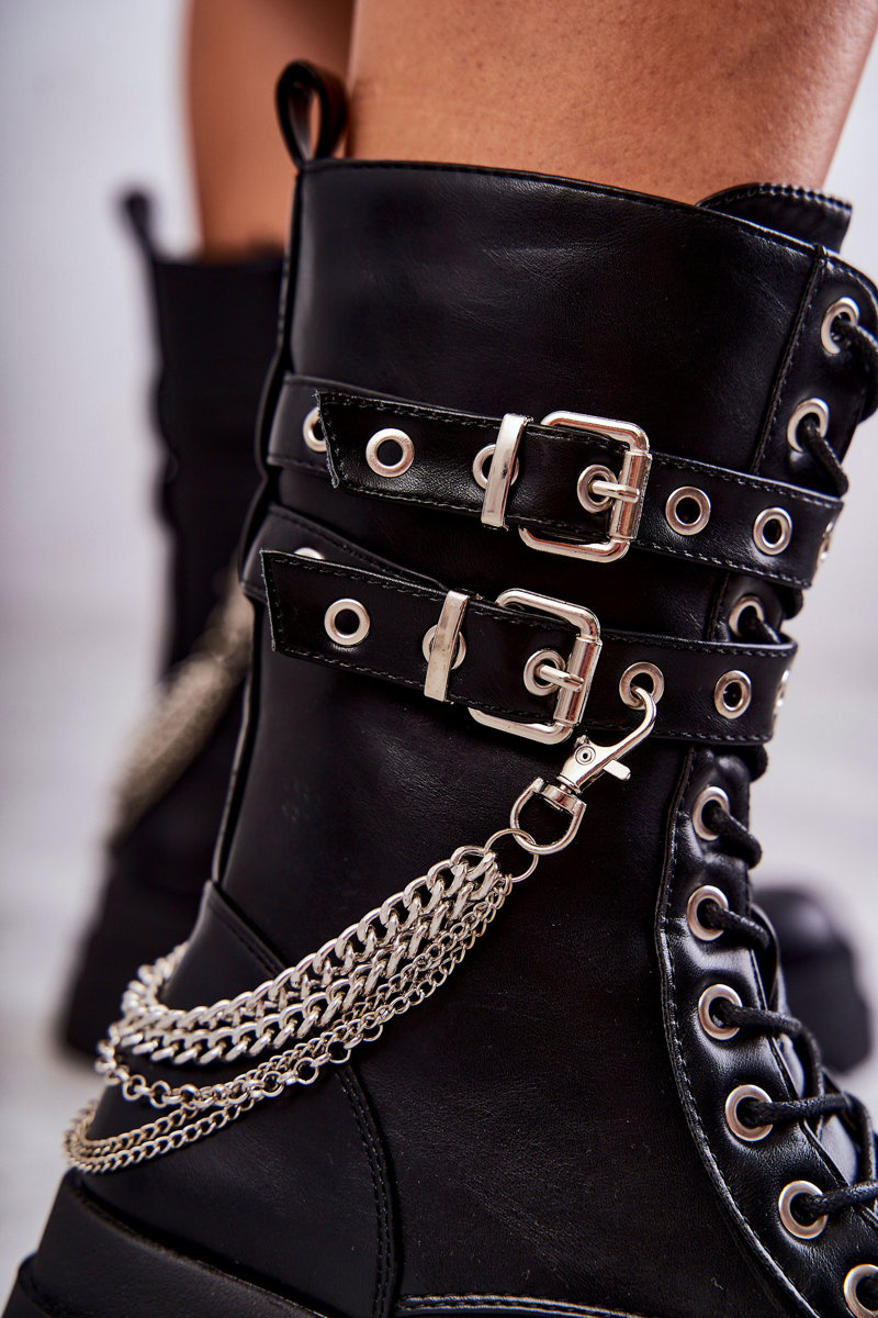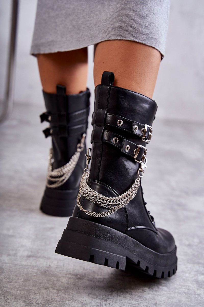Wysokie Workery Botki Z Łańcuchem Czarne Montero