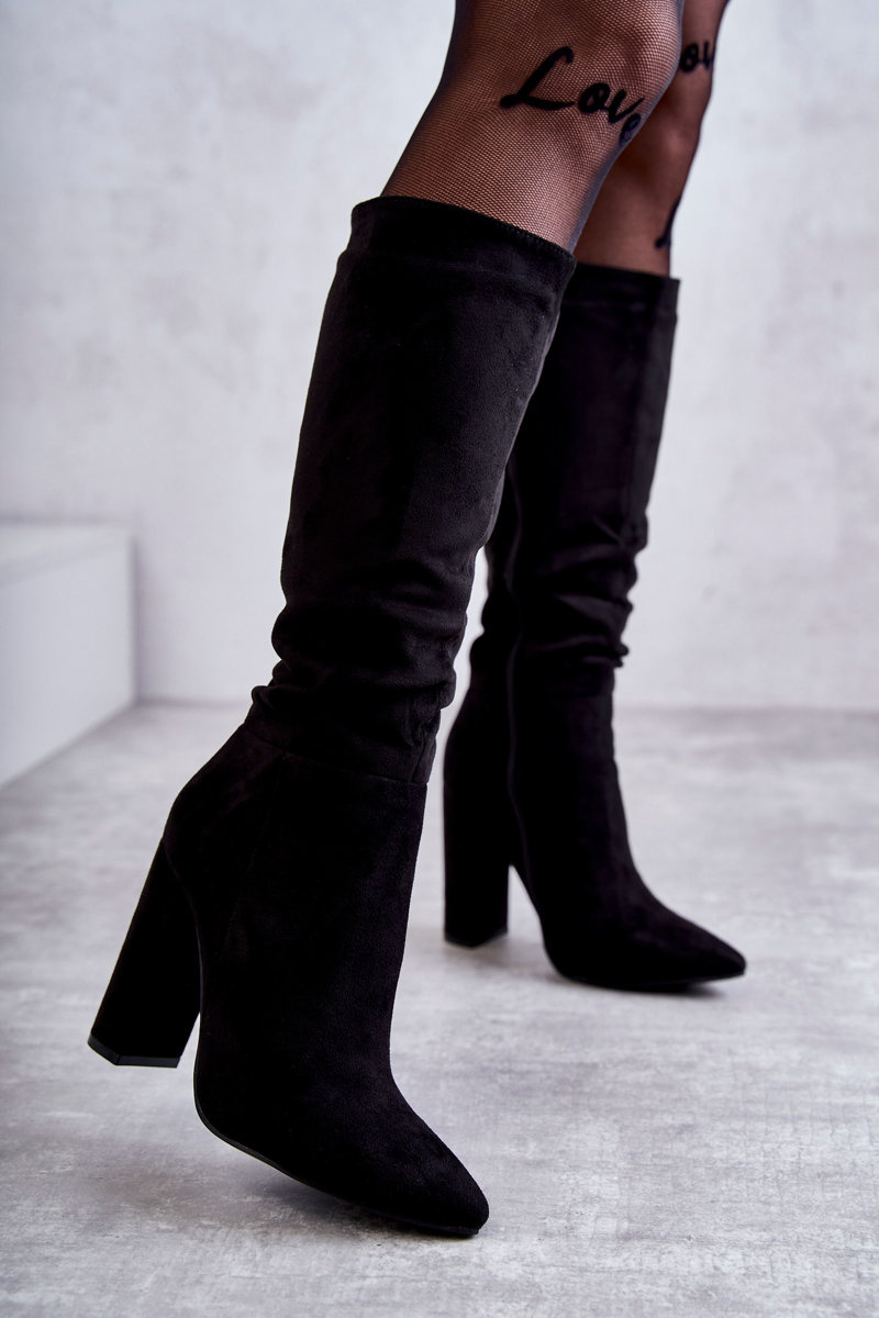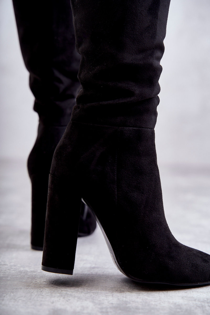 Klasyczne Zamszowe Kozaki Na Obcasie Czarne Tressa