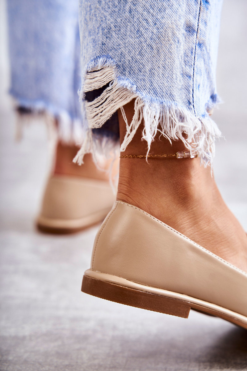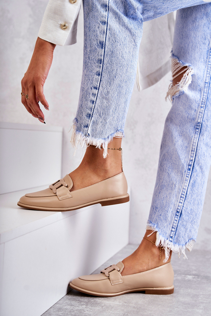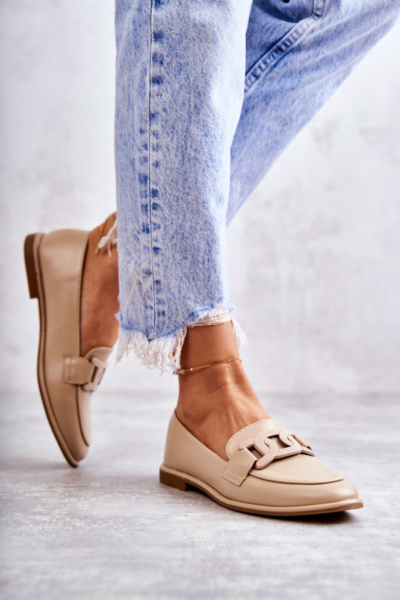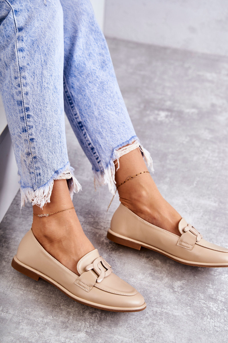 Damskie Skórzane Mokasyny Z Ozdobą Beżowe Kerrie