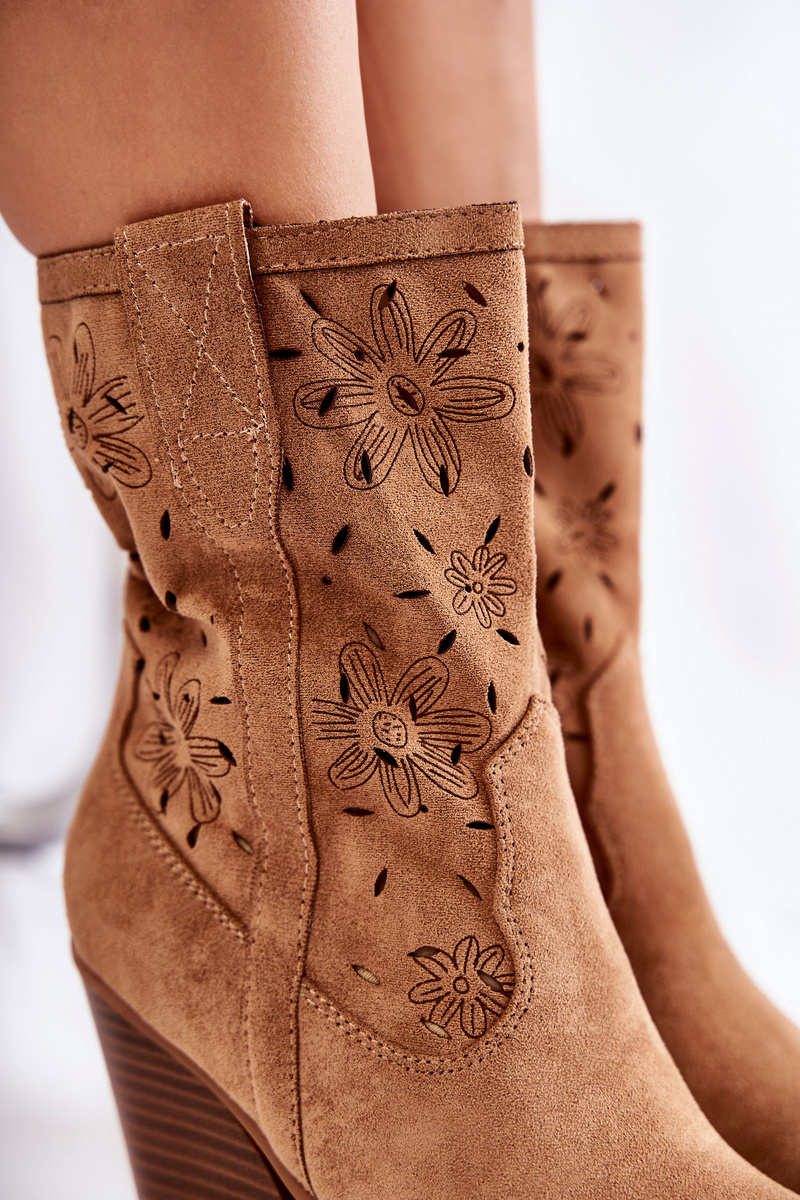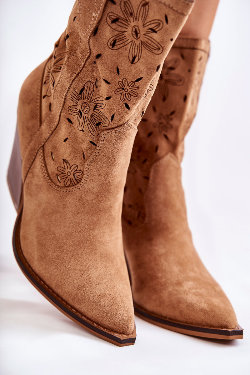 Modne Zamszowe Botki Kowbojki W Kwiaty Camel Coralie