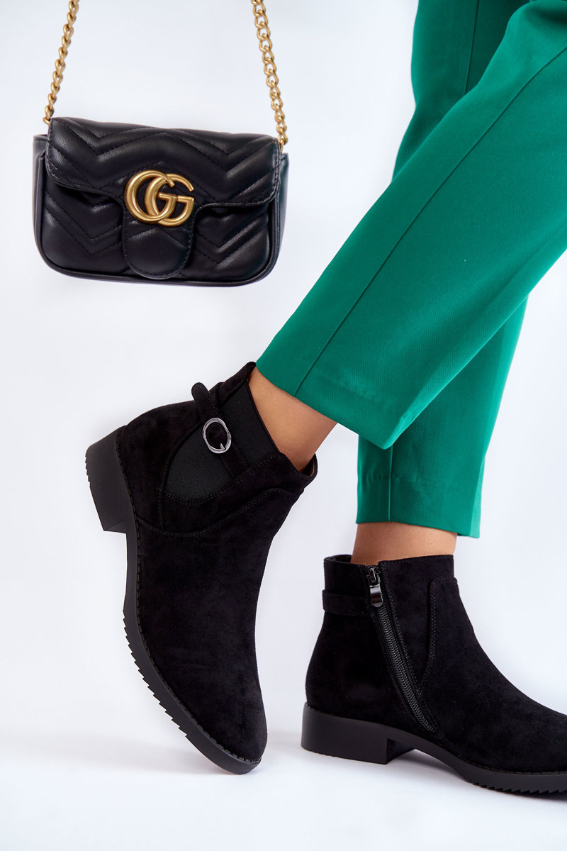 Damskie botki zostały wykonane z eko zamszu. Posiadają ozdobną klamrę na cholewce oraz suwak ułatwiający zakładanie obuwia. Dodatkowo zapiętek w tych butach jest usztywniany. Osadzone na płaskim obcasie, co sprawia, że są niezwykle stabilne podczas użytkowania. Wnętrze botków zostało ocieplone miłym w dotyku kocem obuwniczym. Świetny model do wielu stylizacji! Przy wyborze rozmiaru prosimy sugerować się tabelą rozmiarów.