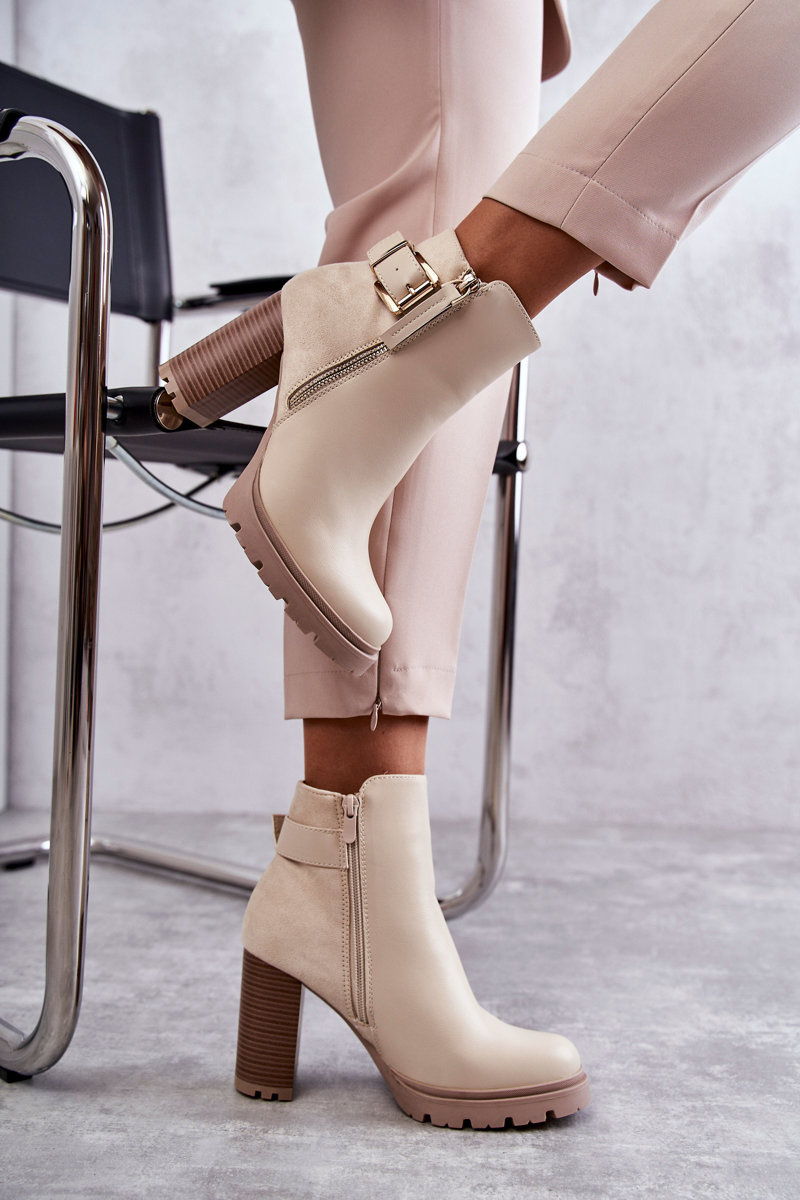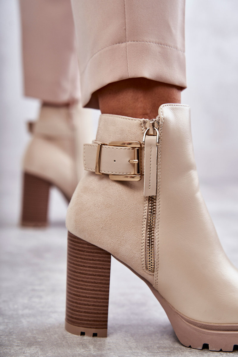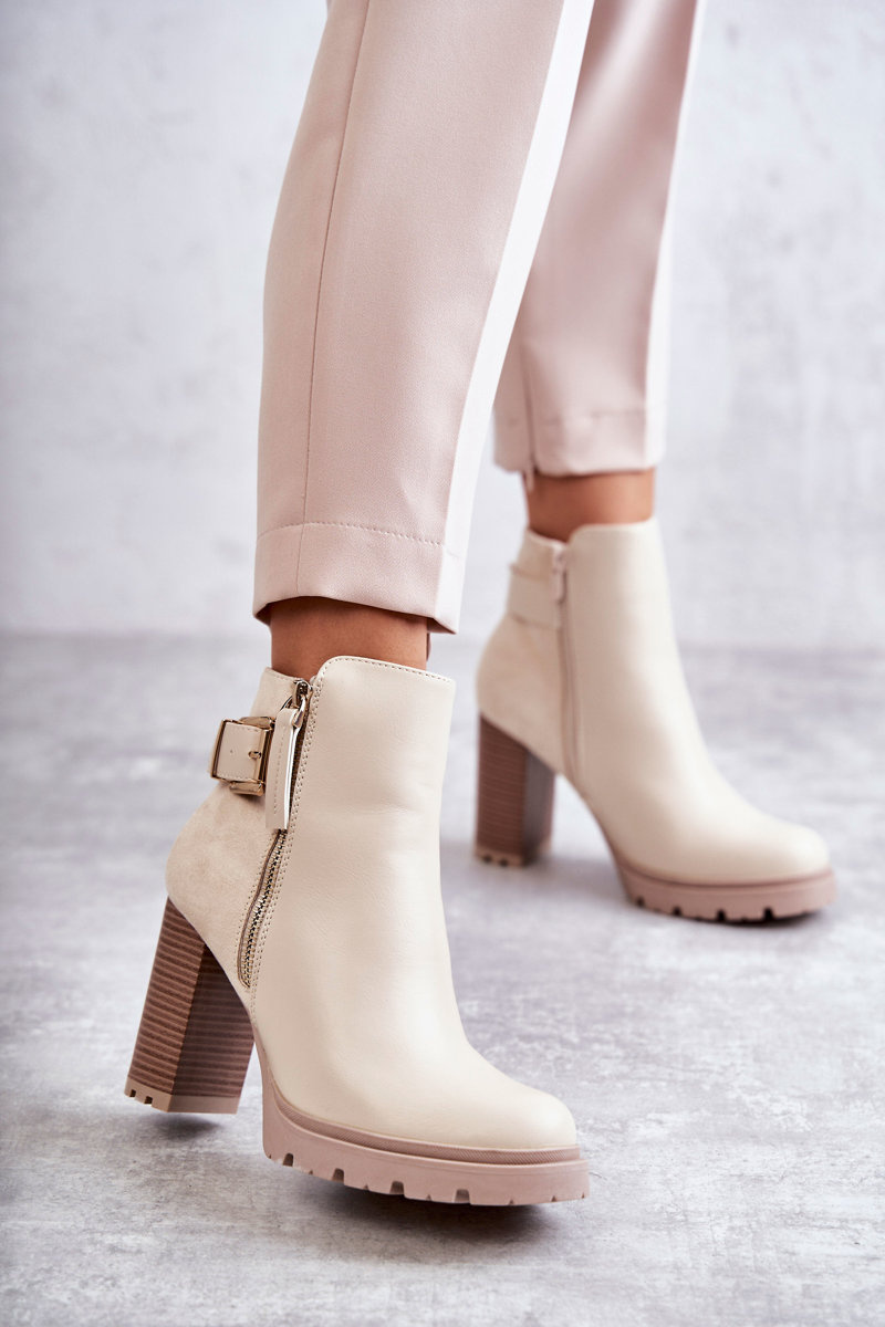 Skórzane Botki Na Obcasie Z Ozdobnym Zamkiem Beżowe Rosita