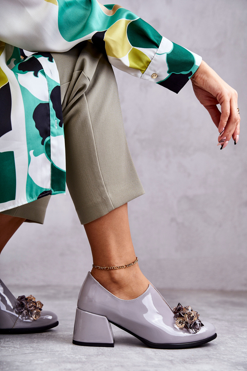 Lakierowane Skórzane Półbuty Gładkie Z Ciemną Ozdobą Szare Delaver