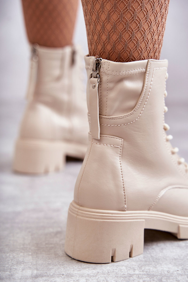 Damskie botki z wyższą cholewką za kostkę zostały wykonane z przyjemnej w dotyku eko skóry. Model ten posiada wiązanie oraz suwak. Osadzone na platformie oraz płaskim obcasie. Podeszwa jest wykonana z gumowego tworzywa. Botki posiadają w środku ocieplenie w postaci miłego w dotyku koca obuwniczego. Zapiętek usztywniany pozwoli na odpowiednią stabilizację stopy. Przy wyborze rozmiaru prosimy sugerować się tabelą rozmiarów.