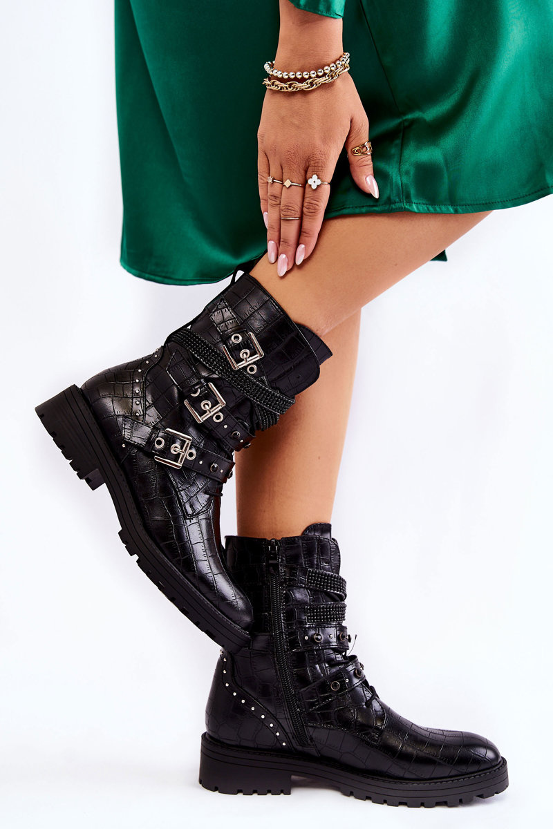Damskie Ocieplane Botki Z Paskami Wężowe Czarne Lamberta