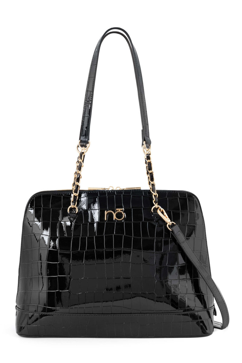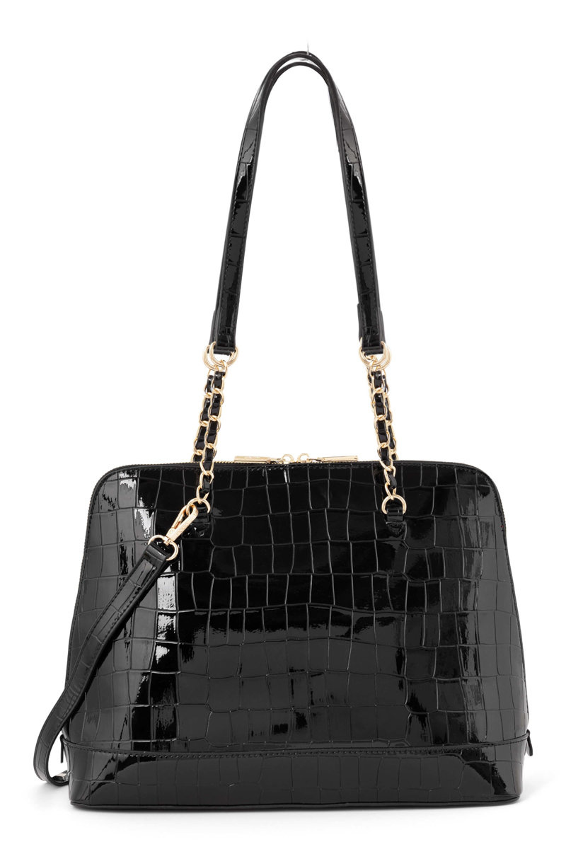 Duża torebka na ramię została wykonana w 100% z poliuretanu, natomiast podszewka w 100% z poliestru. Torebka ma jedną komorę zamykaną na suwak, w której znajdują się dwie otwarte kieszenie oraz jedna zamykana na suwak. Posiada ozdobne tłoczenie imitujące krokodylą skórę oraz logo na przodzie. Lakierowany materiał przyciąga wzrok oraz nadaje niepowtarzalny charakter.