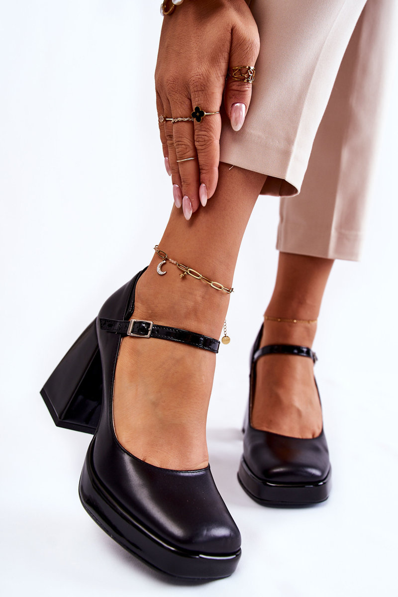 Wyjątkowe czółenka wykonane z wysokiej jakości naturalnej skóry. Posiadają regulowany pasek zapinany na sprzączkę. Osadzone na masywnym, wyższym obcasie w postaci klocka. Zapiętek jest usztywniany, a nosek kwadratowy. Miękka wkładka zapewnia wygodę podczas użytkowania. Dodatkowo buty posiadają delikatną platformę. Świetny model na różnego rodzaju uroczystości. Przy wyborze rozmiaru prosimy sugerować się tabelą rozmiarów.