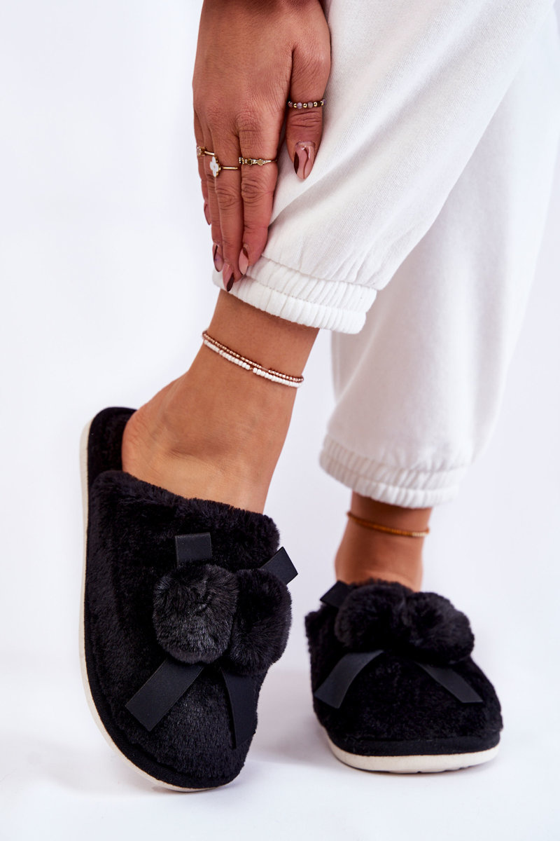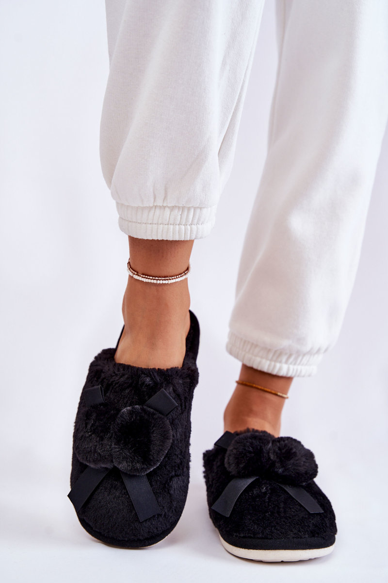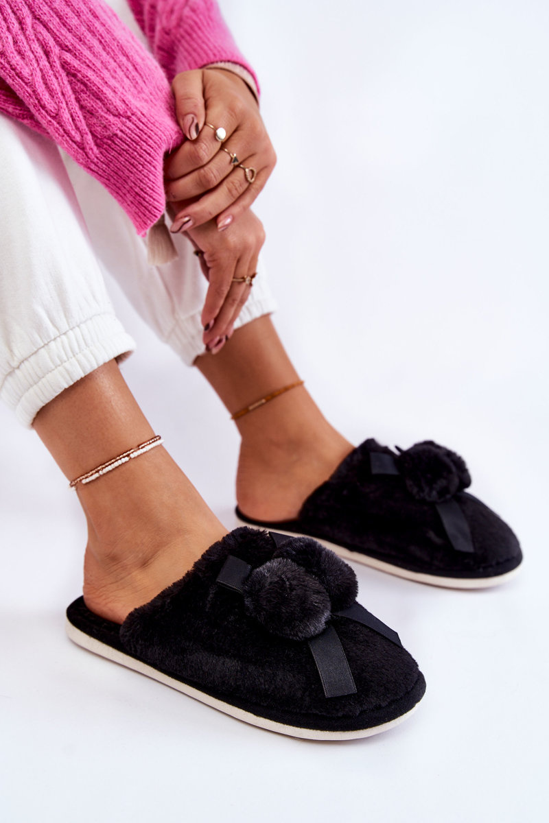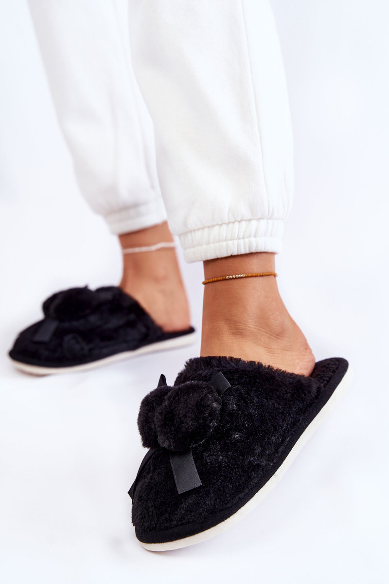 Damskie Futrzane Papcie Z Pomponami Czarne Castello