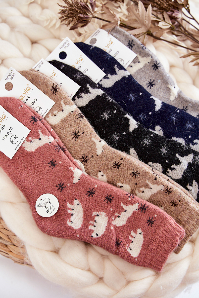 Ciepłe skarpetki damskie zostały wykonane głównie z wełny. Idealnie sprawdzą się podczas chłodnych dni. Posiadają zimowe wzory w niedźwiedzie polarne. Delikatny ściągacz sprawi, że będą idealnie dopasowane. Te termoaktywne skarpety idealnie sprawdzą się dla każdego zmarzlucha!