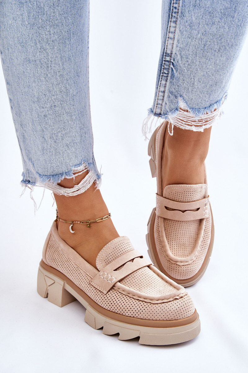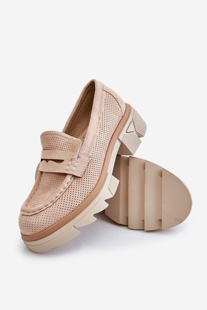 Damskie półbuty w stylu mokasynów zostały osadzone na masywnym, płaskim obcasie i platformie. Wykonane z materiału przypominającego eko zamsz. Miękka wkładka z naturalnej skóry zapewni wygodę podczas użytkowania. Cholewka w ażurowy wzór. Zapiętek został usztywniony. Świetny model do wielu stylizacji! Przy wyborze rozmiaru prosimy sugerować się tabelą rozmiarów.