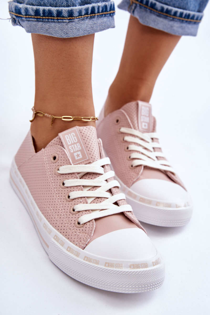 Klasyczne, damskie trampki wykonane z eko skóry z perforacją na cholewce. Model ten posiada wzmocniony nosek. Zapiętek nie jest usztywniany. Logo marki Big Star zostało umieszczone na platformie. Ten model z pewnością przypadnie do gustu miłośniczkom modowych nowinek, wygody i komfortowego użytkowania. Koniecznie powinnaś je mieć! Przy wyborze rozmiaru prosimy sugerować się tabelą rozmiarów.